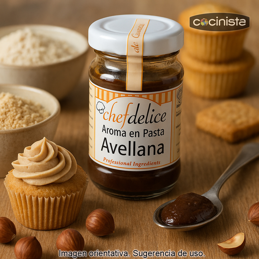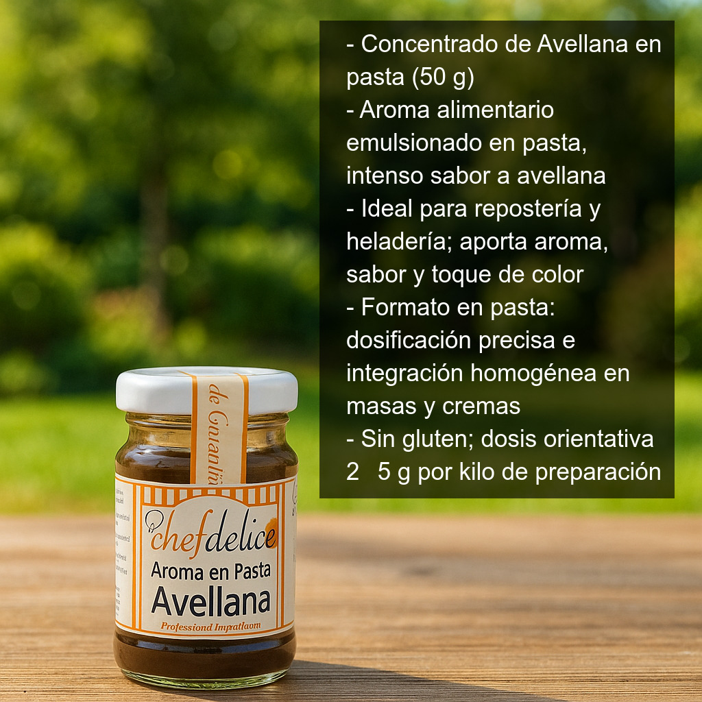 Concentrado de Avellana en pasta (50 g) para repostería y heladería: aroma alimentario emulsionado en pasta con intenso sabor a avellana que aporta aroma, sabor y un toque de color a tus elaboraciones. Su formato en pasta facilita una dosificación precisa y una integración homogénea en masas, cremas y mezclas, logrando un resultado estable y profesional.