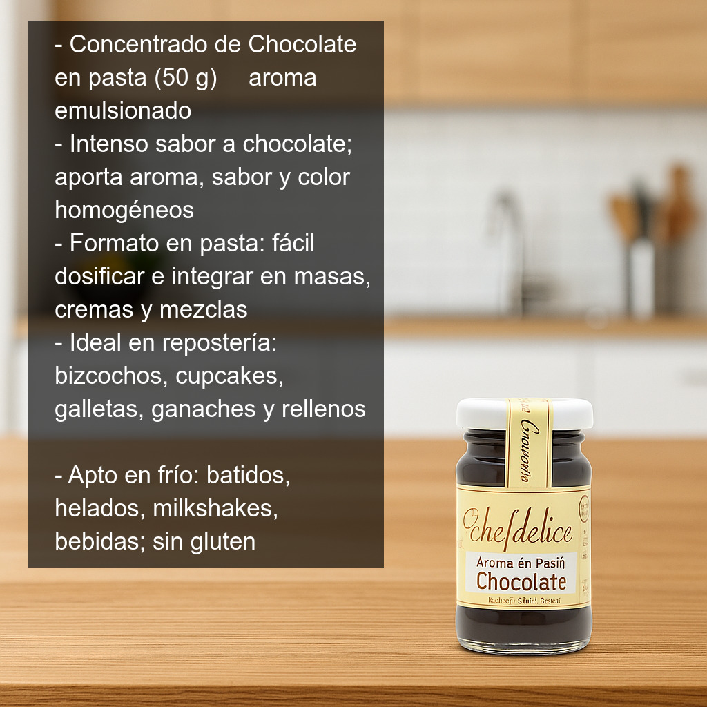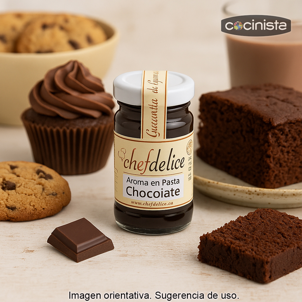 Concentrado de Chocolate en pasta (50 g) – Aroma emulsionado en pasta alimentario con intenso sabor a chocolate, ideal para aportar aroma, sabor y color de forma homogénea en todo tipo de elaboraciones de repostería y pastelería. Su formato en pasta facilita la dosificación y la integración en masas, cremas y mezclas, consiguiendo un resultado más uniforme que con aromas líquidos en muchas preparaciones.