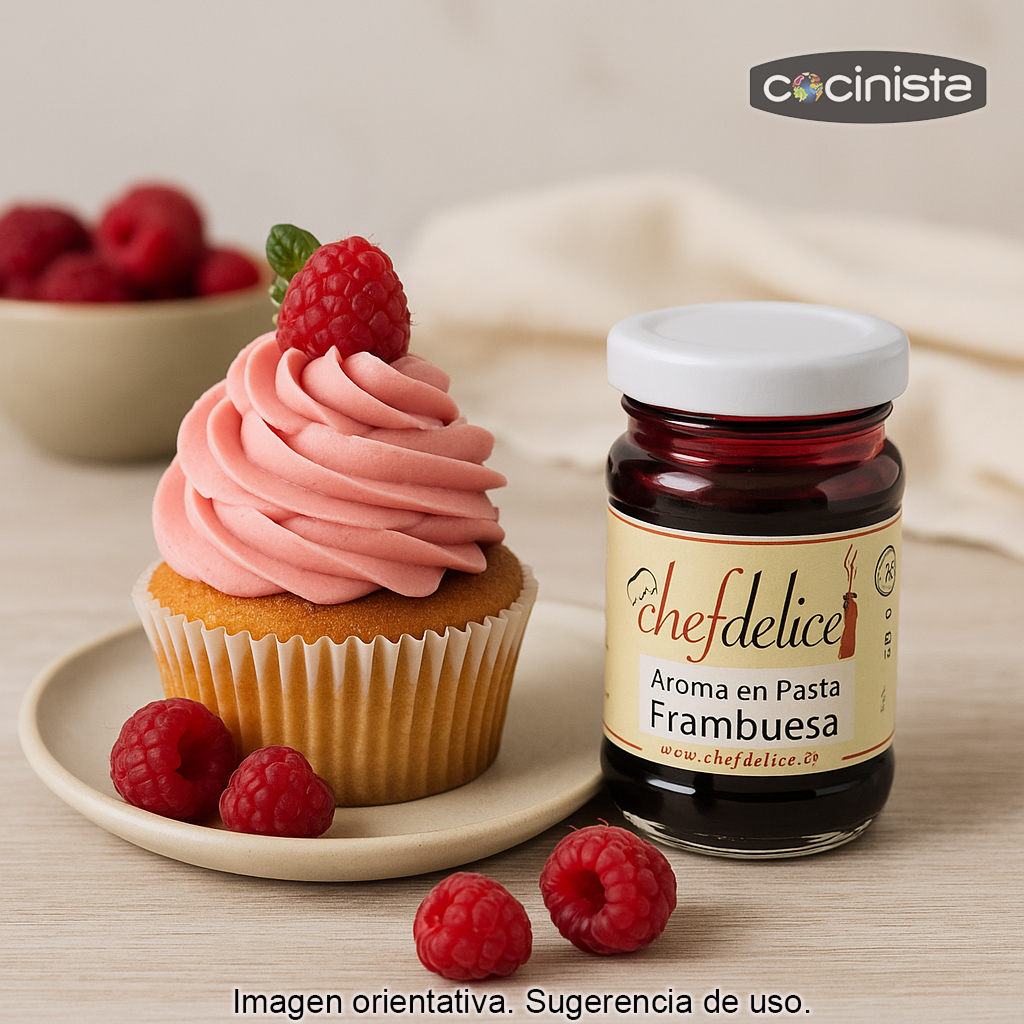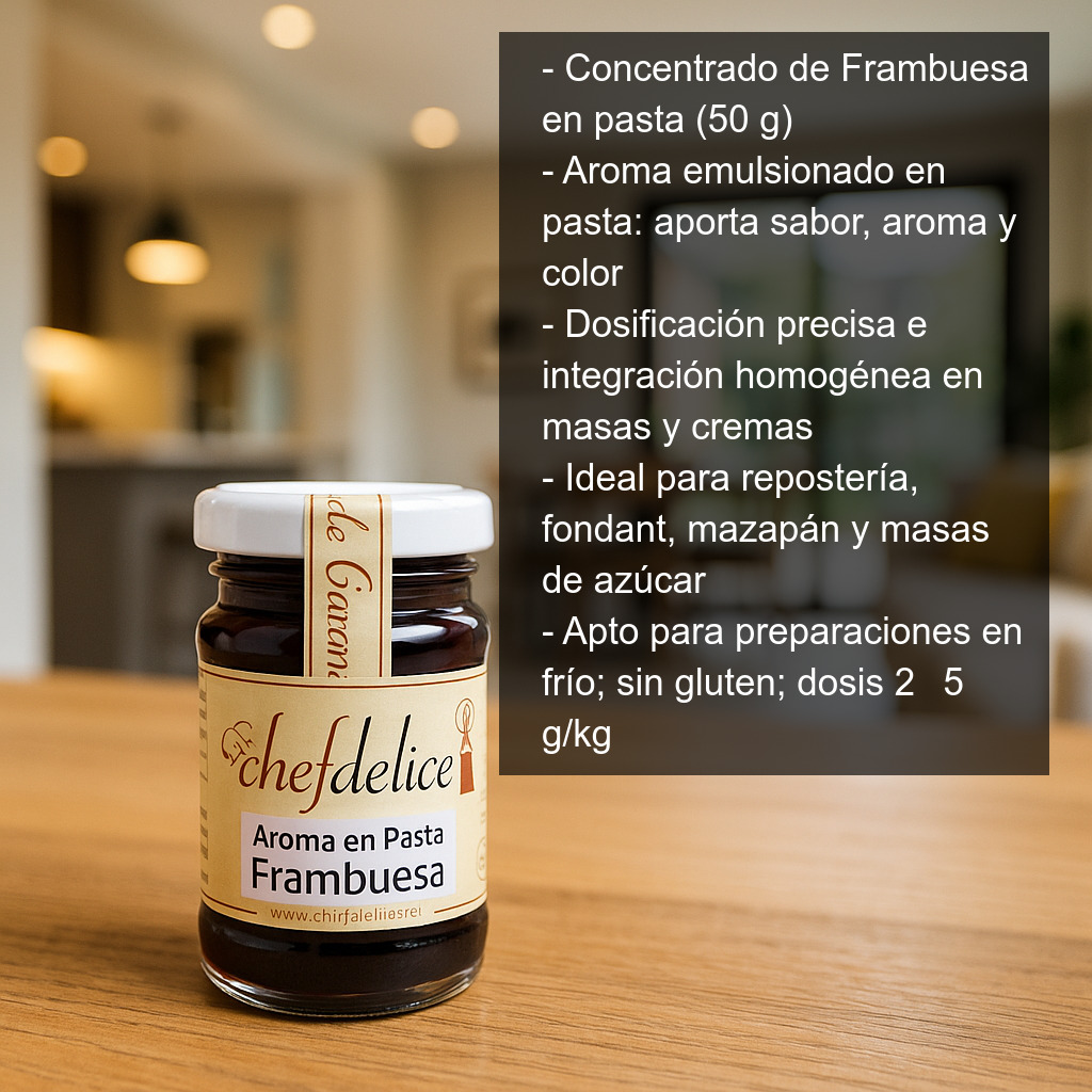 Concentrado de Frambuesa en pasta (50 g) – Aroma alimentario emulsionado en pasta con intenso sabor a frambuesa que aporta aroma, color y un toque afrutado a tus elaboraciones. Su formato en pasta facilita una dosificación precisa y una integración homogénea en masas, cremas y mezclas, logrando un resultado estable y uniforme.
