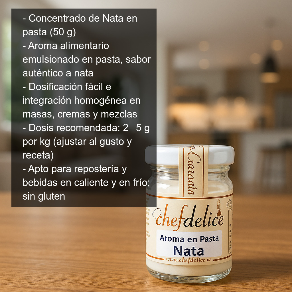 Concentrado de Nata en pasta (50 g) es un aroma alimentario emulsionado en pasta con auténtico sabor a nata, pensado para aportar aroma, sabor y un toque de color de forma homogénea en todo tipo de elaboraciones de repostería y pastelería. Su formato en pasta facilita la dosificación y la integración en masas, cremas y mezclas, logrando un resultado estable y uniforme.