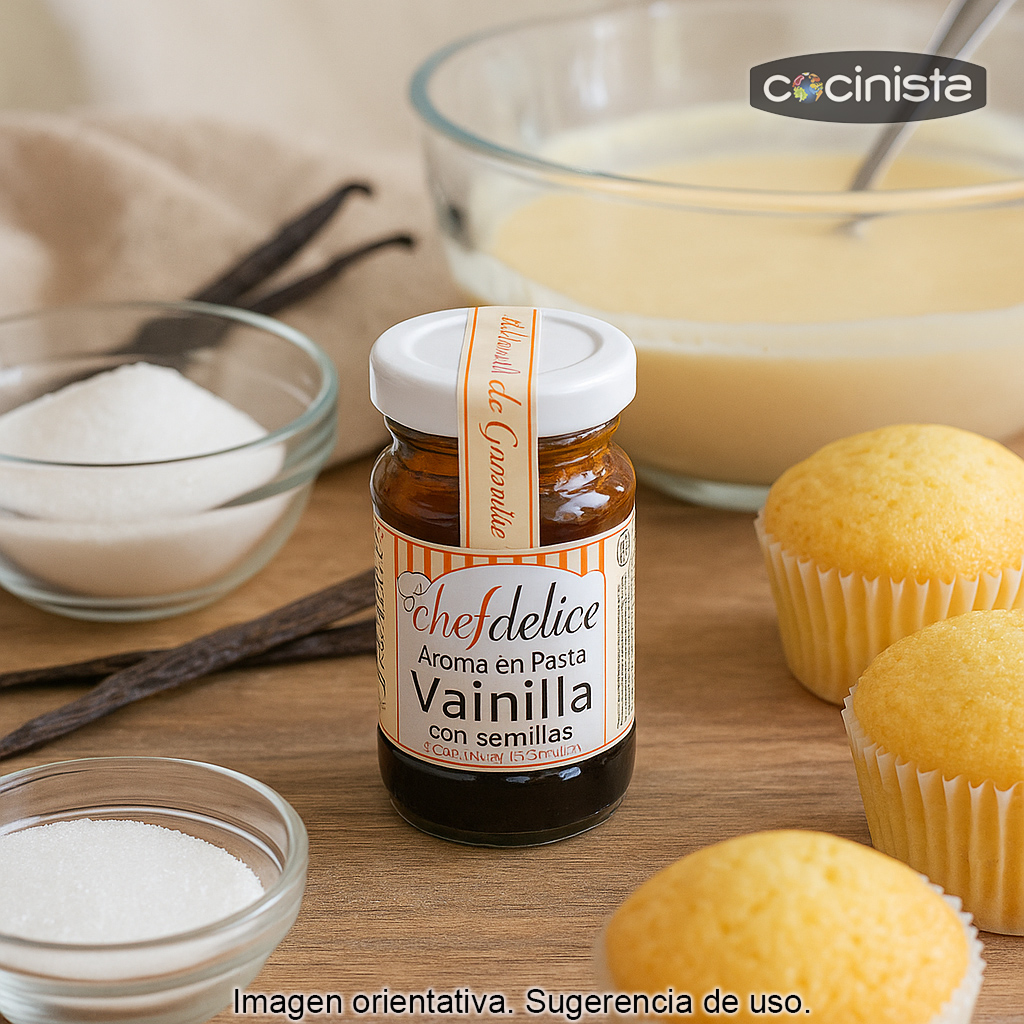 Este concentrado de vainilla es ideal para aromatizar y dar color a preparaciones como bizcochos, cupcakes, magdalenas, galletas, caramelos, frosting, buttercream, cremas y rellenos. También funciona muy bien en pasta fondant y otras coberturas, aportando un sabor equilibrado sin necesidad de añadir grandes cantidades.