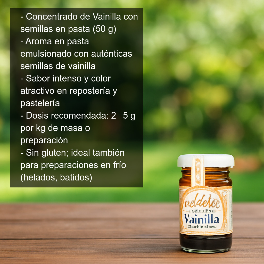 Concentrado de Vainilla con semillas en pasta (50 g) es un aroma alimentario emulsionado en pasta con auténticas semillas de vainilla, diseñado para aportar sabor intenso y un atractivo color a todo tipo de elaboraciones de repostería y pastelería. Su formato en pasta facilita una dosificación precisa y una integración homogénea en masas, cremas y mezclas, logrando un resultado profesional con un toque de vainilla muy natural.