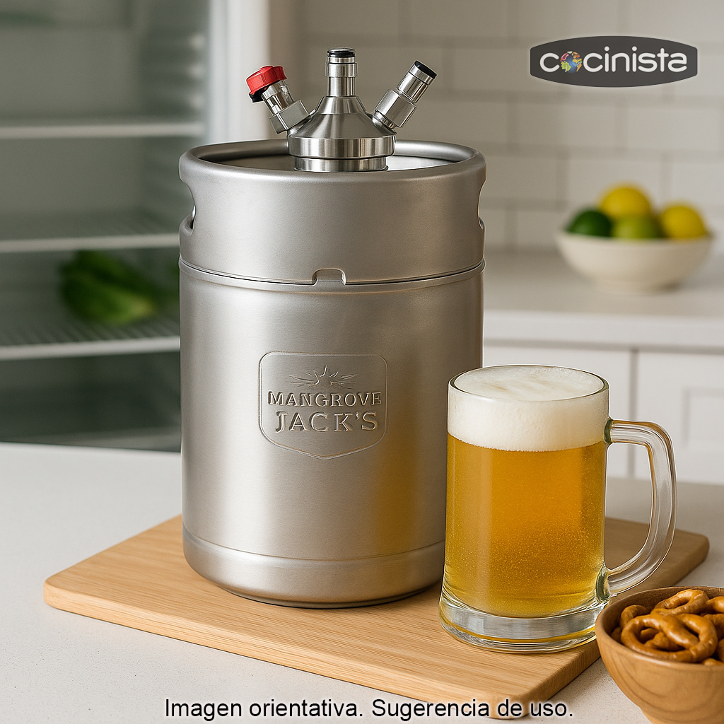 Gracias a su formato reducido (5 L), es ideal para quienes elaboran cerveza en casa y quieren un recipiente práctico para dispensar cerveza carbonatada sin necesidad de un keg grande. Su tamaño permite guardarlo en la nevera con facilidad, llevarlo a reuniones o utilizarlo para lotes pequeños, pruebas y experimentos, evitando desperdiciar esa cantidad de cerveza que no encaja en otros barriles o en botellas.