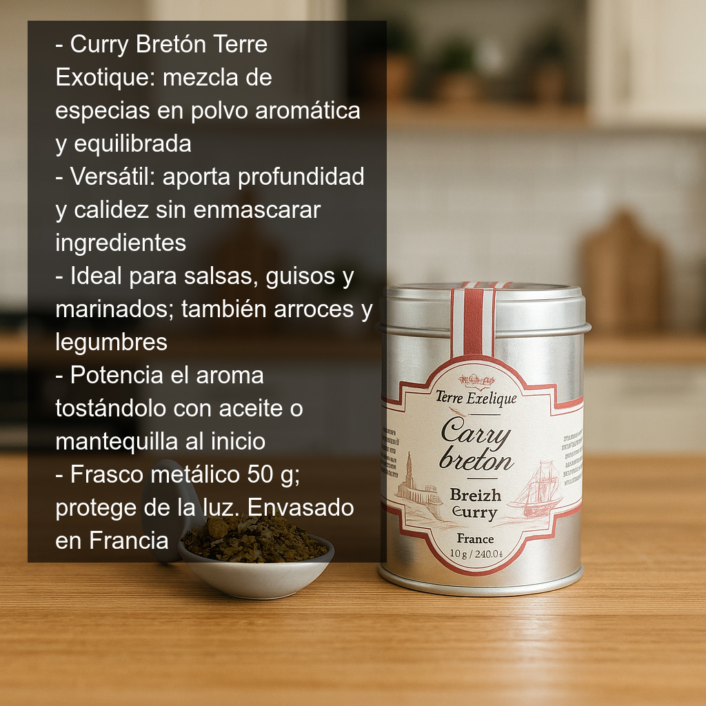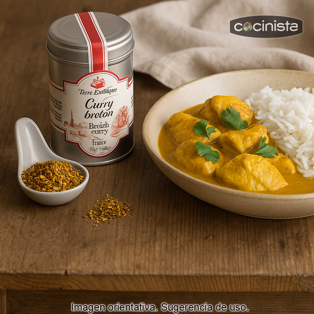 El Curry Bretón de Terre Exotique es una mezcla de especias en polvo con carácter, inspirada en la historia marinera de la Bretaña francesa y en la época de la Compañía Francesa de las Indias Orientales, cuando las rutas oceánicas acercaban a Europa las especias más codiciadas. El resultado es un curry aromático, equilibrado y muy versátil, pensado para dar profundidad y calidez a tus recetas sin enmascarar el sabor de los ingredientes.