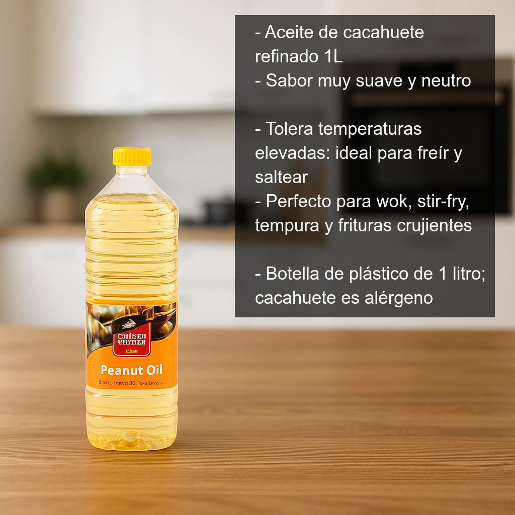 El aceite de cacahuete refinado (también conocido como aceite de maní) es un básico muy valorado en la cocina asiática por su versatilidad y por el toque característico que aporta a salteados, frituras y recetas al wok. Esta presentación en botella de 1 litro es ideal tanto para uso doméstico como para cocinas que buscan un aceite estable y cómodo para cocinar a diario.