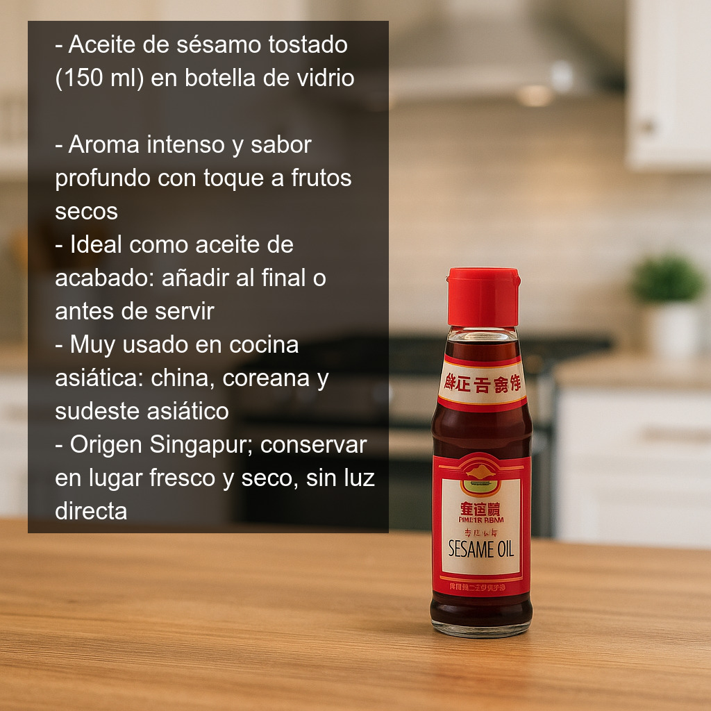 Aceite de sésamo tostado (150 ml) elaborado a partir de semillas de sésamo cuidadosamente tostadas para obtener un aroma intenso, un sabor profundo y un característico toque a frutos secos. Es un aceite muy apreciado en la cocina asiática por su capacidad para realzar y redondear el sabor de los platos con solo unas gotas.