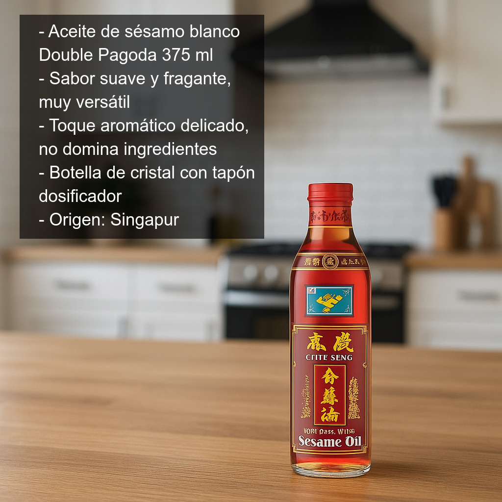 El aceite de sésamo blanco Double Pagoda (375 ml) es un aceite suave, fragante y muy versátil, elaborado a partir de semillas de sésamo para aportar un toque aromático delicado sin dominar el resto de ingredientes. Es un básico en la cocina asiática (china, japonesa, coreana y del sudeste asiático) y cada vez más utilizado en recetas occidentales por su capacidad para realzar sabores con solo unas gotas.