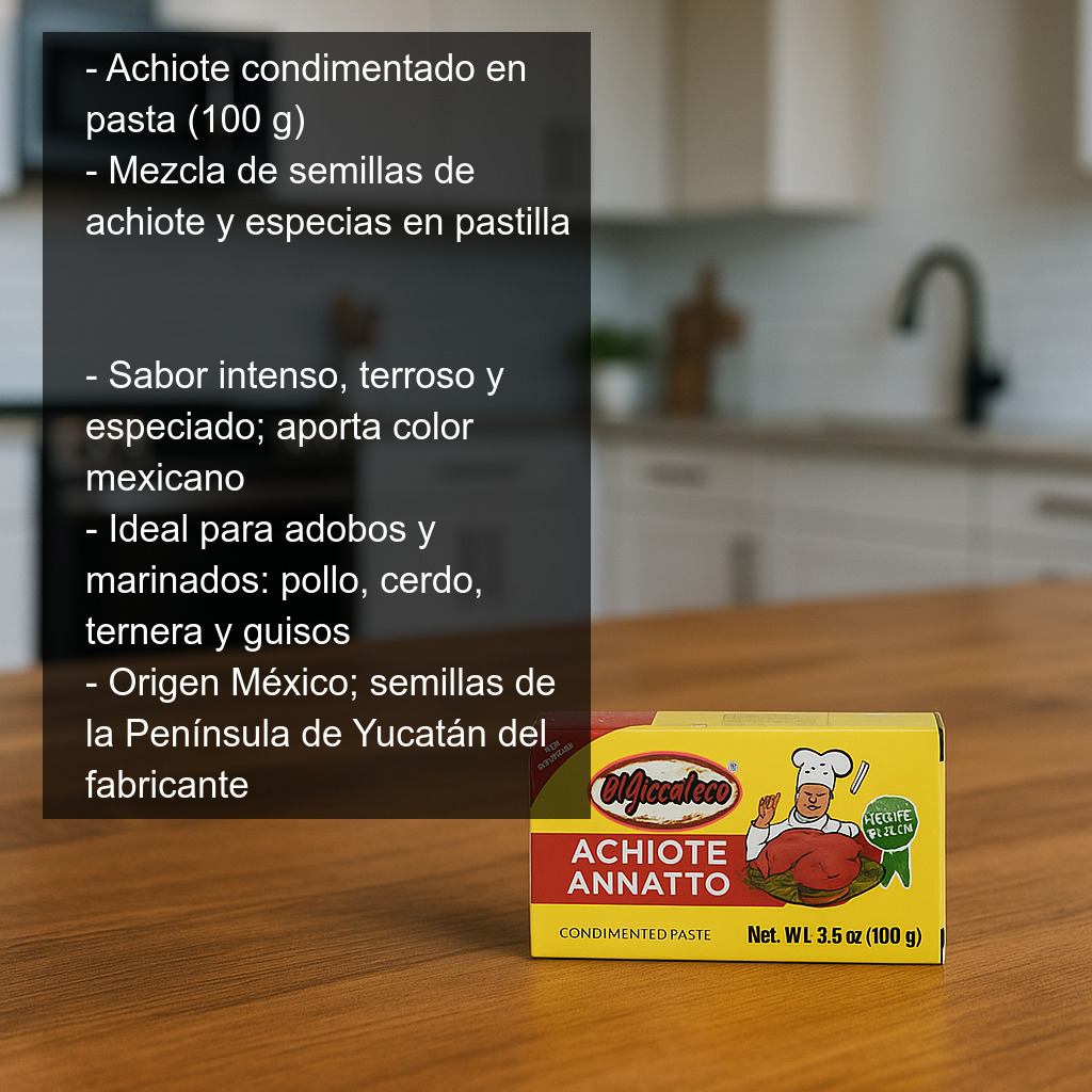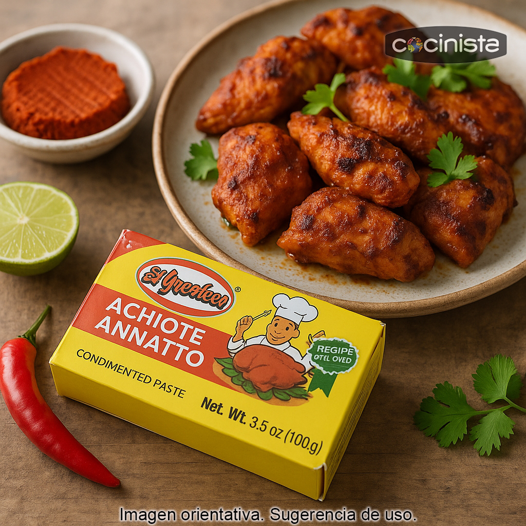 - Formato: caja de 100 g (pastilla de achiote condimentado).