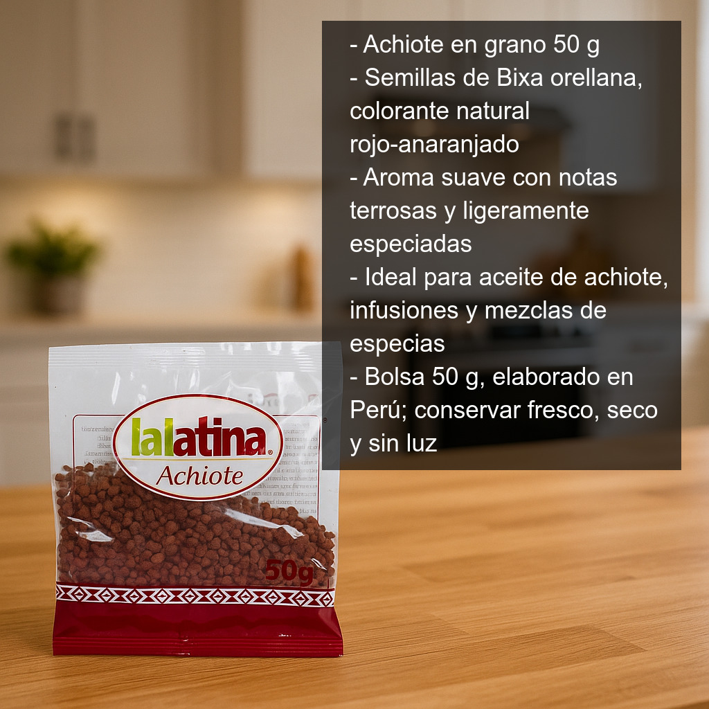 El achiote en grano (semillas de Bixa orellana) es un ingrediente tradicional de la cocina latinoamericana, muy apreciado como colorante natural y como base aromática para adobos, marinados y recados. Sus semillas aportan un tono rojo-anaranjado intenso a guisos y salsas, además de un aroma suave con notas terrosas y ligeramente especiadas.