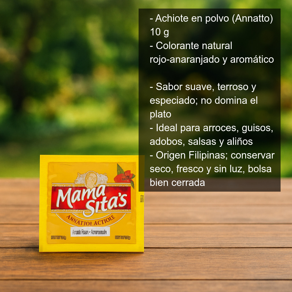 El achiote en polvo (también conocido como annatto o onoto) es una especia ideal para quienes buscan un colorante natural rojo-anaranjado con un toque aromático característico. Se utiliza tradicionalmente en numerosas cocinas del mundo para aportar color intenso y un sabor suave, ligeramente terroso y especiado, que realza guisos, arroces y marinados sin dominar el plato.