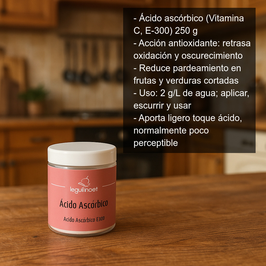 El ácido ascórbico, también conocido como Vitamina C (E-300), es un ingrediente muy utilizado en cocina y repostería por su acción antioxidante. Ayuda a retrasar la oxidación (el oscurecimiento) de frutas y verduras una vez cortadas, por lo que es ideal para mantener un aspecto fresco y apetecible en preparaciones como ensaladas de frutas, guacamole, macedonias, toppings para tartas, bowls, smoothies y fruta lista para llevar.