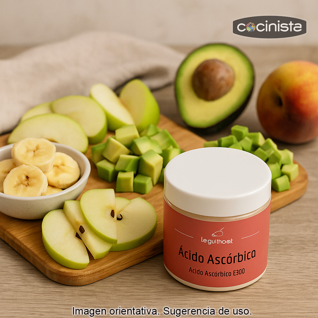 El ácido ascórbico, también conocido como Vitamina C (E-300), es un ingrediente muy versátil en cocina y repostería. Actúa como potente antioxidante y ayuda a retrasar la oxidación de alimentos, por lo que es ideal para evitar que frutas y verduras se oscurezcan tras pelarlas o cortarlas. Es especialmente útil en manzana, plátano, aguacate, pera, melocotón o patata, manteniendo un aspecto más fresco y apetecible durante más tiempo.