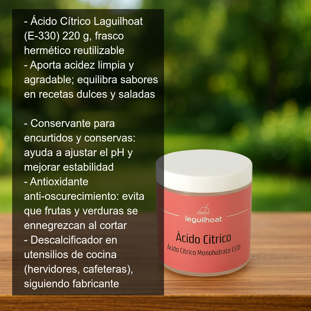 El ácido cítrico es un ingrediente imprescindible en despensa por su versatilidad: aporta acidez limpia y agradable, ayuda a conservar y actúa como antioxidante. Este Ácido Cítrico Laguilhoat (E-330) es ideal tanto para recetas dulces como saladas, para conservas y para pequeñas tareas de limpieza en cocina.