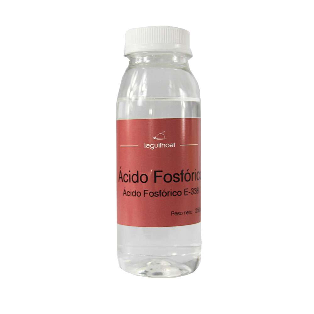 Ácido fosfórico en solución al 75% de concentración. El ácido fosfórico es el ingrediente alimentario E338 usado como saborizante y regulador de acidez.