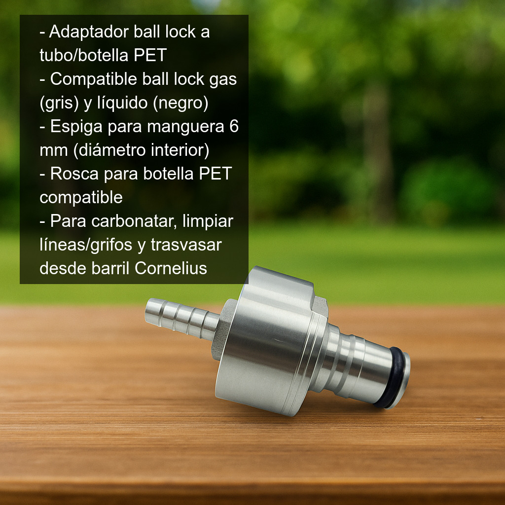 Un adaptador imprescindible si buscas una solución compacta para conectar tu ball lock a una manguera o enroscarlo a una botella PET y así simplificar tareas de carbonatación, mantenimiento y manejo de cerveza de barril.
