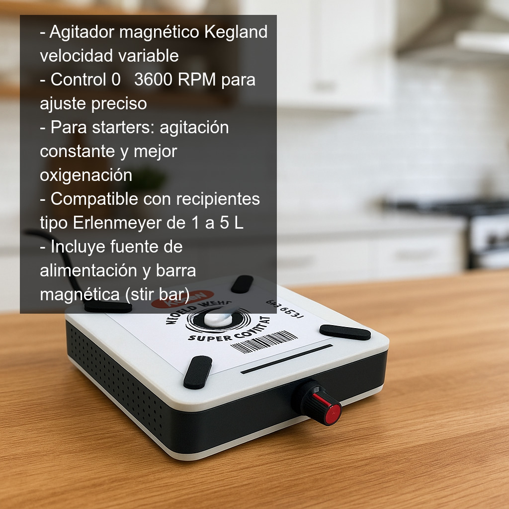 El agitador magnético Kegland de velocidad variable es una herramienta imprescindible para quienes elaboran cerveza en casa y para múltiples aplicaciones de laboratorio. Está especialmente indicado para la activación y propagación de levadura (starter), ya que permite mantener el mosto en movimiento constante, mejorando la oxigenación y favoreciendo un crecimiento más rápido y homogéneo de la levadura.