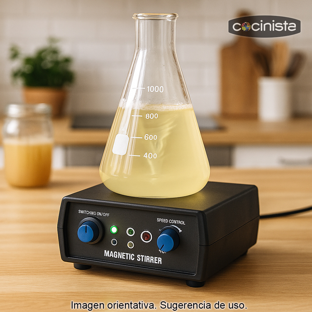Agitador magnético de laboratorio para matraces de hasta 1 litro, ideal para preparar starters de levadura de forma cómoda y eficiente. Mantiene el líquido en movimiento constante, favoreciendo la oxigenación y la multiplicación de la levadura, lo que se traduce en fermentaciones más sanas y resultados más consistentes en tus elaboraciones.
