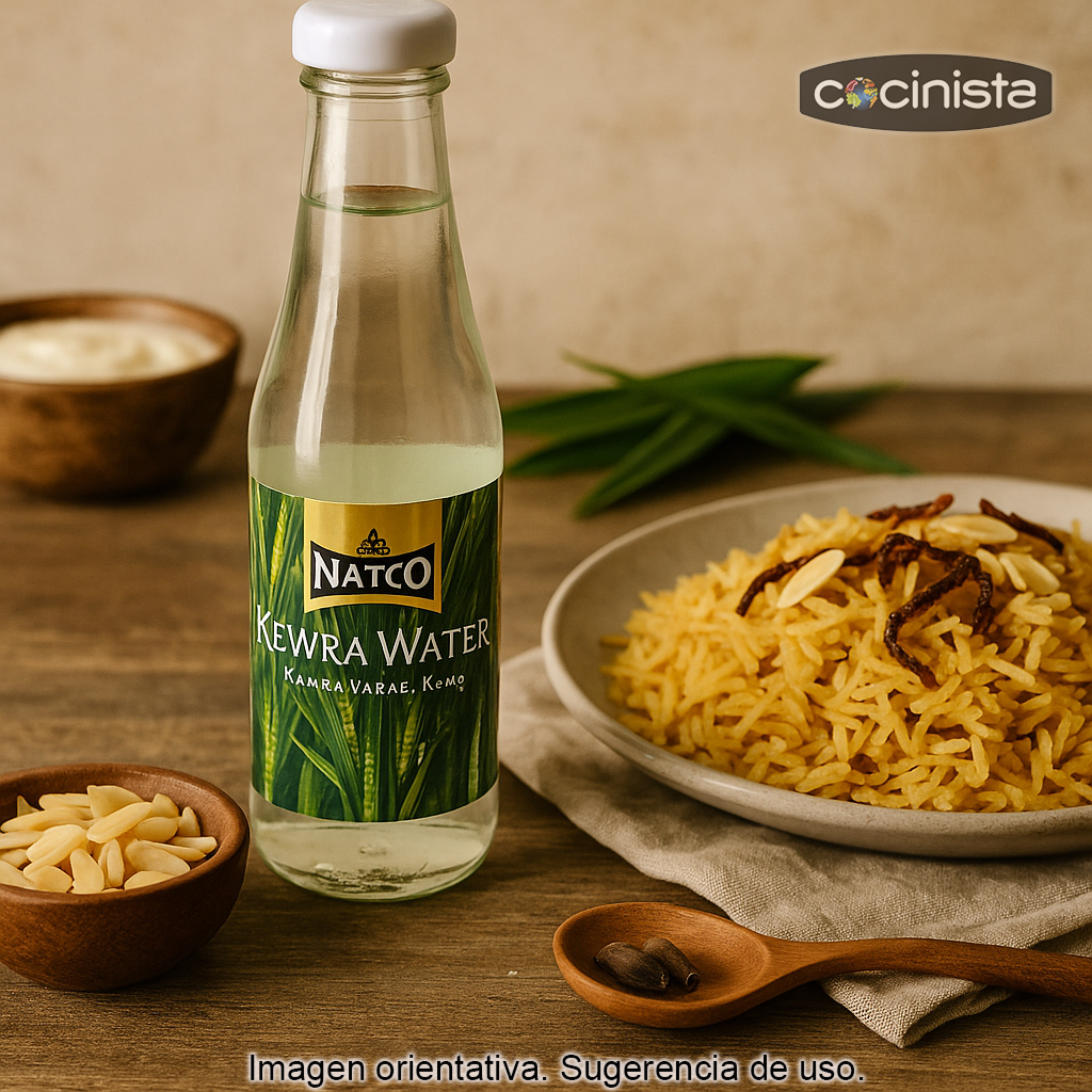 Agua de Kewra en botella de cristal con formato de 310 ml, perfecta para tener en despensa y aromatizar múltiples recetas con un toque auténtico de la cocina india y asiática.