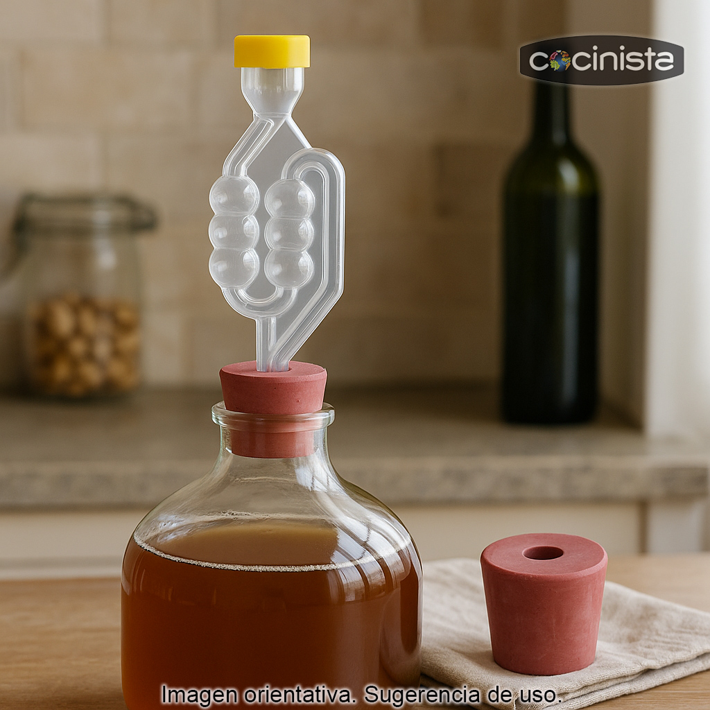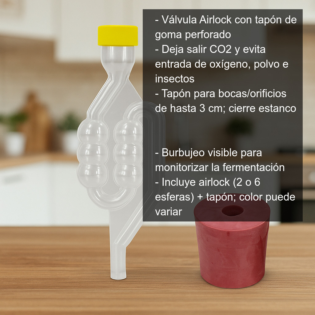 Este modelo incluye un tapón de goma con orificio que facilita la instalación en recipientes con boca u orificio de hasta 3 cm, logrando un cierre estable y estanco. Es ideal para cerveza artesanal, vino, sidra, hidromiel, kombucha y otras fermentaciones caseras.