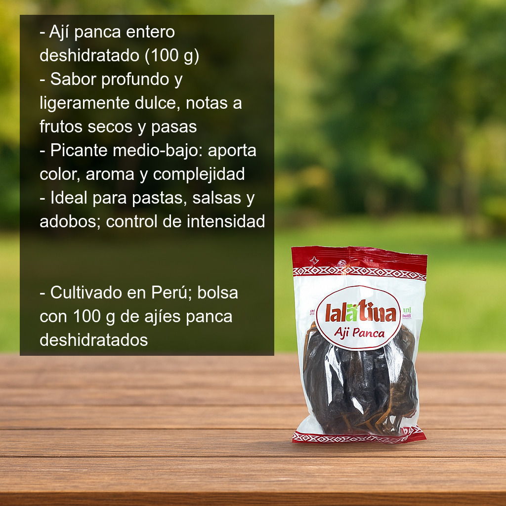 Ají panca entero deshidratado (100 g). El chile o ají panca es una de las variedades más emblemáticas y utilizadas de la cocina peruana. Se caracteriza por su sabor profundo y ligeramente dulce, con notas que recuerdan a frutos secos y pasas, y un picante medio-bajo que aporta color, aroma y complejidad sin dominar el plato.