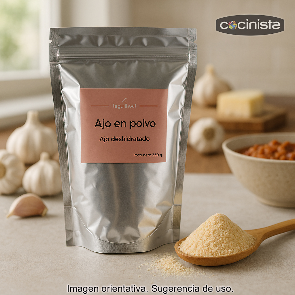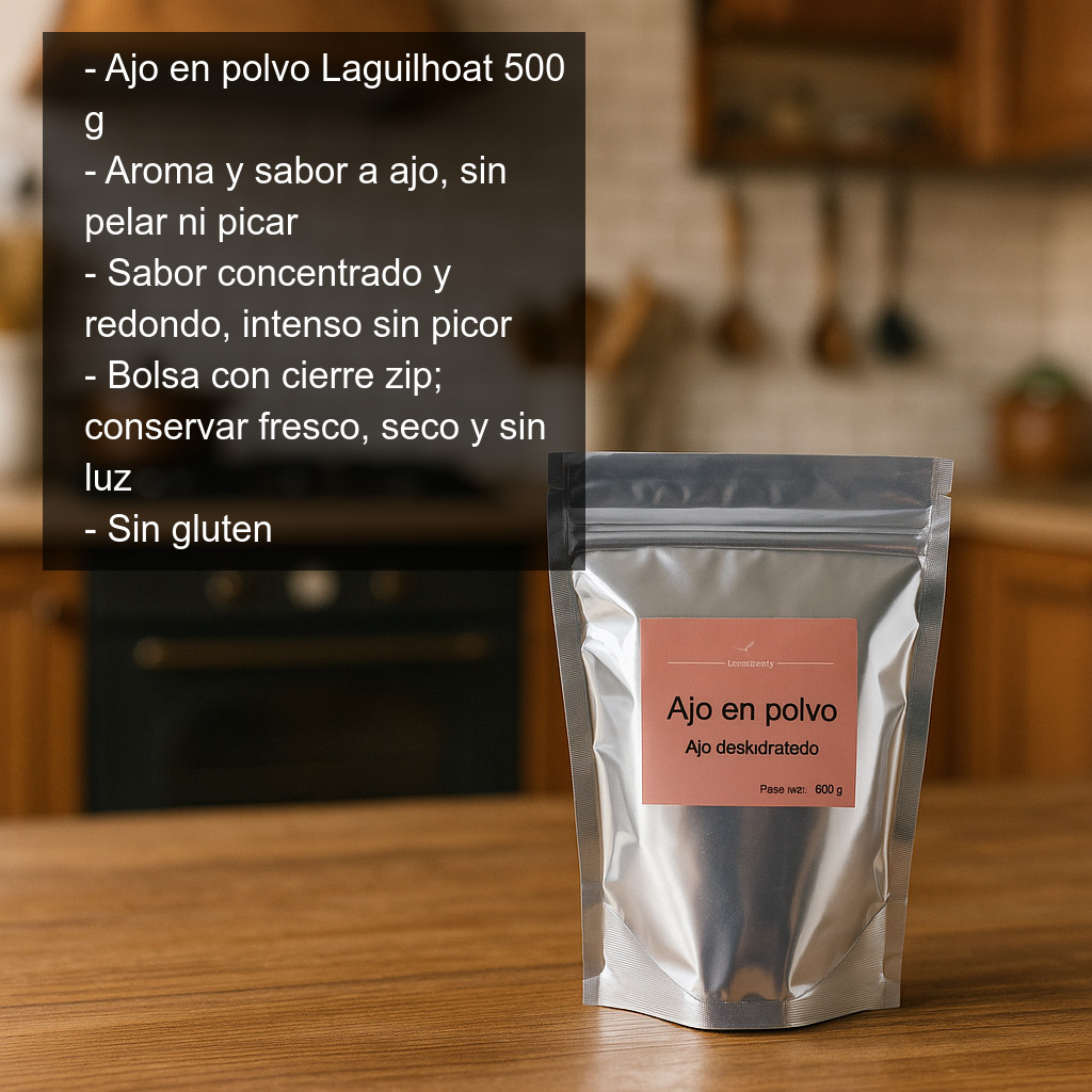 El ajo en polvo de Laguilhoat se presenta en una bolsa con cierre zip con 500 g de producto, pensada para un uso cómodo y una mejor conservación del aroma. Para mantener su calidad, guárdalo bien cerrado en un lugar fresco, seco y protegido de la luz.