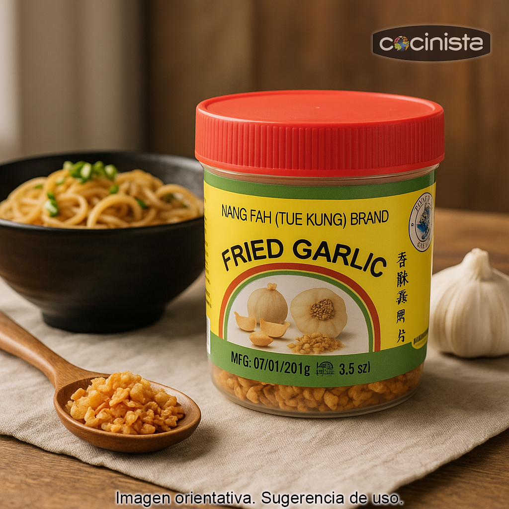 Este ajo frito asiático se utiliza ampliamente en la gastronomía de países como Tailandia, Vietnam, China o Filipinas, donde se emplea como topping, condimento final o ingrediente aromático para realzar recetas saladas. Gracias a su formato listo para usar, permite ahorrar tiempo sin renunciar al sabor auténtico del ajo frito casero.