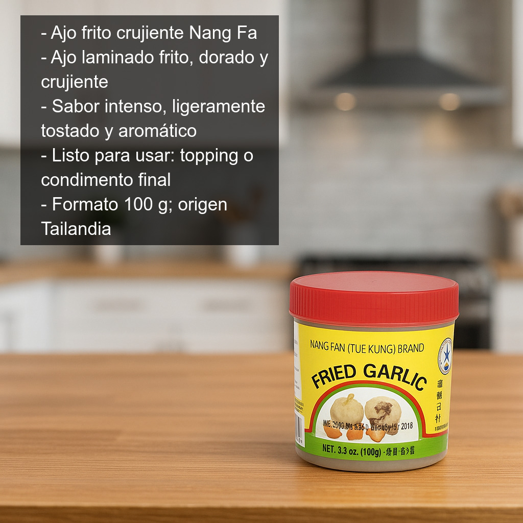 El ajo frito crujiente de Nang Fa es un ingrediente imprescindible en la cocina asiática, elaborado a partir de ajo laminado cuidadosamente frito hasta conseguir una textura dorada, crujiente y un aroma intenso. Su sabor profundo y ligeramente tostado aporta un extra de carácter a todo tipo de platos, convirtiéndolo en un condimento versátil y muy apreciado tanto en cocina tradicional como en propuestas modernas.