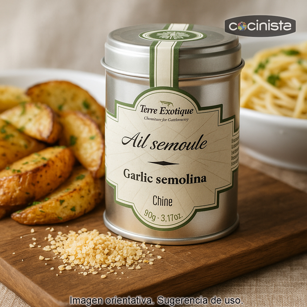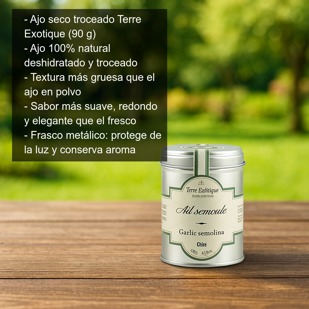 El ajo seco troceado (también conocido como sémola de ajo o ajo deshidratado granulado) es ajo 100% natural que se ha deshidratado y posteriormente molido en pequeños trocitos. Su textura es más gruesa que el ajo en polvo, lo que permite un uso muy cómodo en cocina: aporta aroma y sabor a ajo de forma uniforme, sin necesidad de pelar ni picar.