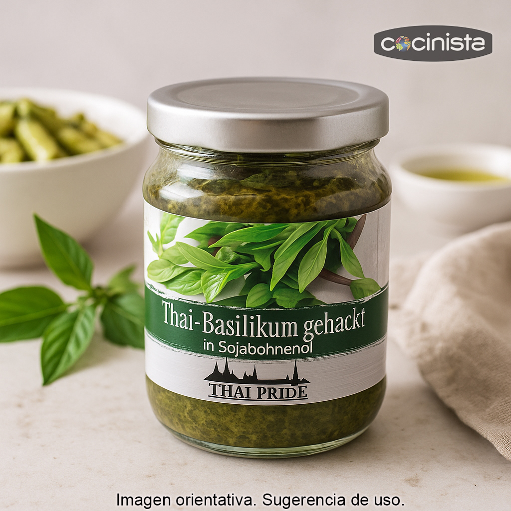 Albahaca picada (175 g) elaborada con albahaca tailandesa y conservada en aceite de soja, lista para usar. Es una alternativa muy práctica a la albahaca fresca cuando quieres cocinar con su aroma característico sin preocuparte por la estacionalidad o por que se estropee rápidamente. Se presenta en frasco de cristal, ideal para conservar en la nevera y dosificar fácilmente.