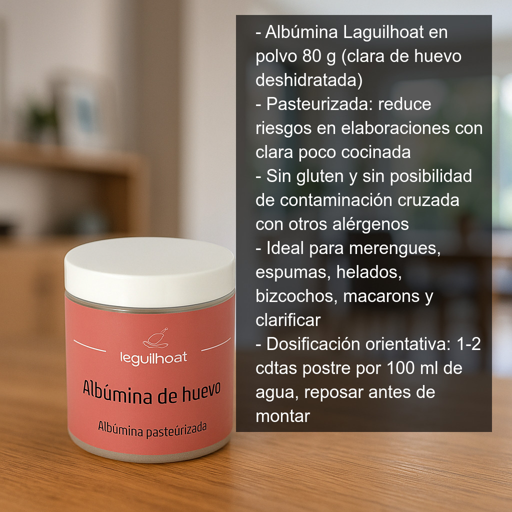 La Albúmina Laguilhoat se presenta en frasco con cierre hermético con 80 g de producto, pensado para mantener la calidad y facilitar su uso en el día a día, tanto en cocina doméstica como en pastelería profesional.