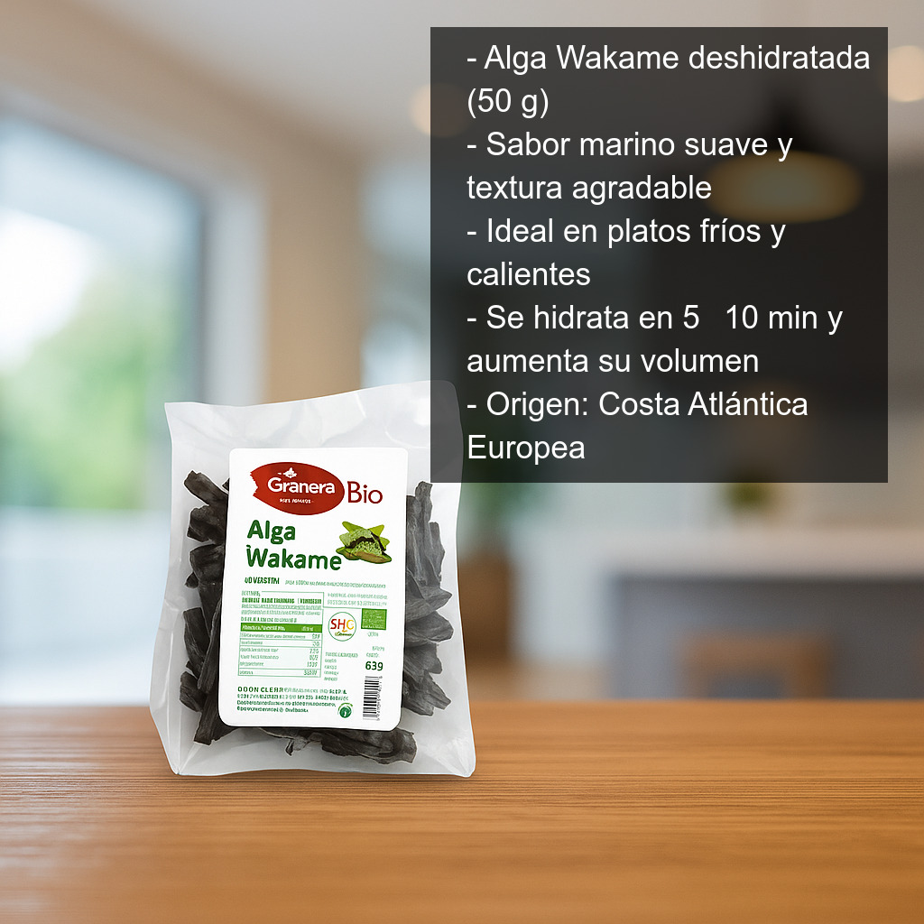 Alga Wakame deshidratada (50 g), un ingrediente básico de la cocina japonesa y asiática, ideal para aportar un toque marino suave y una textura agradable a tus recetas. La wakame es muy apreciada por su sabor delicado (menos intenso que otras algas) y por su versatilidad: funciona igual de bien en preparaciones frías como en platos calientes.