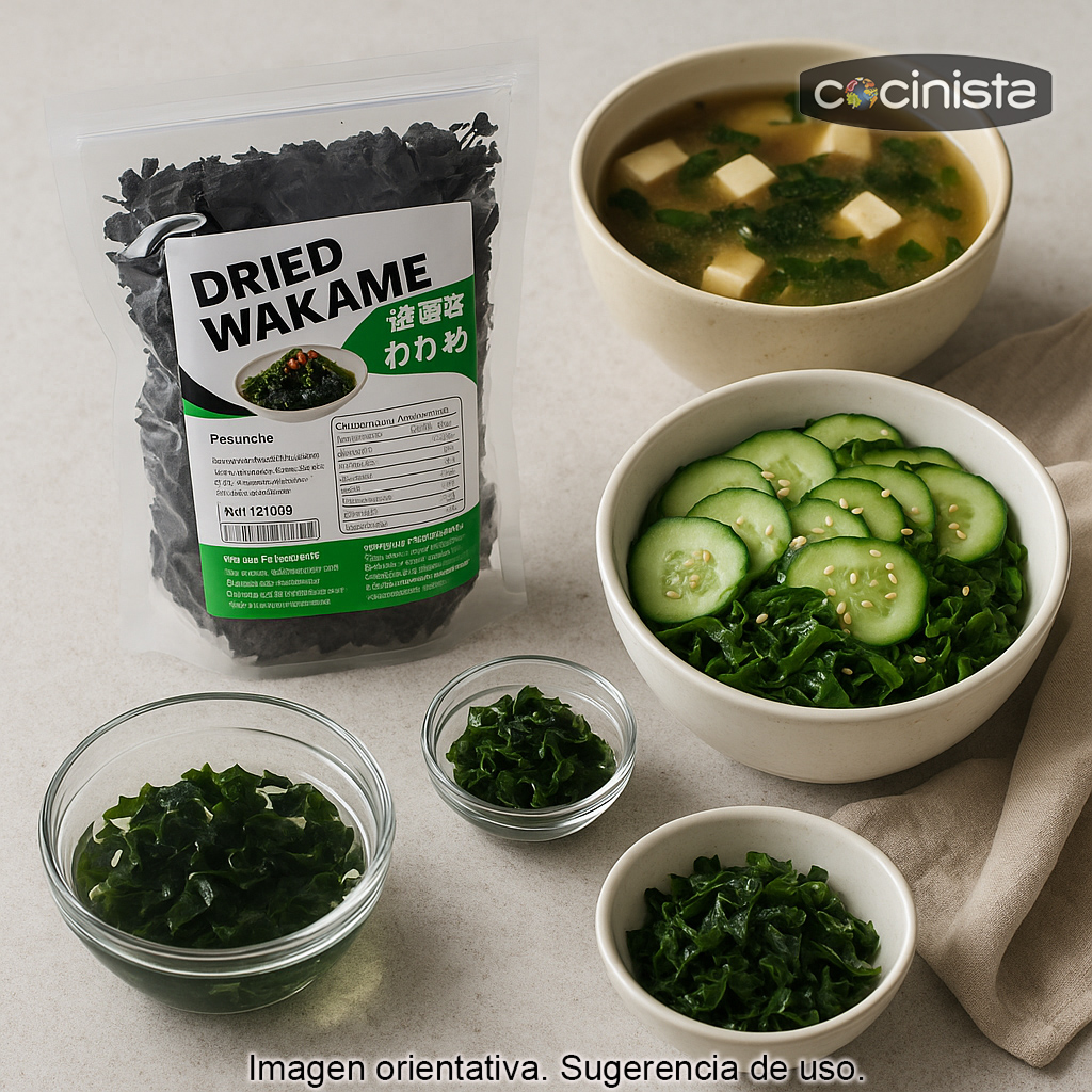 Alga wakame deshidratada en formato de 200 g, ideal para tener siempre a mano en la despensa y preparar recetas de inspiración asiática con un toque marino suave y muy característico. El wakame es una de las algas más utilizadas en la cocina japonesa y china, especialmente en sopas, ensaladas y platos con caldo, ya que aporta sabor (umami) y una textura agradable una vez rehidratada.