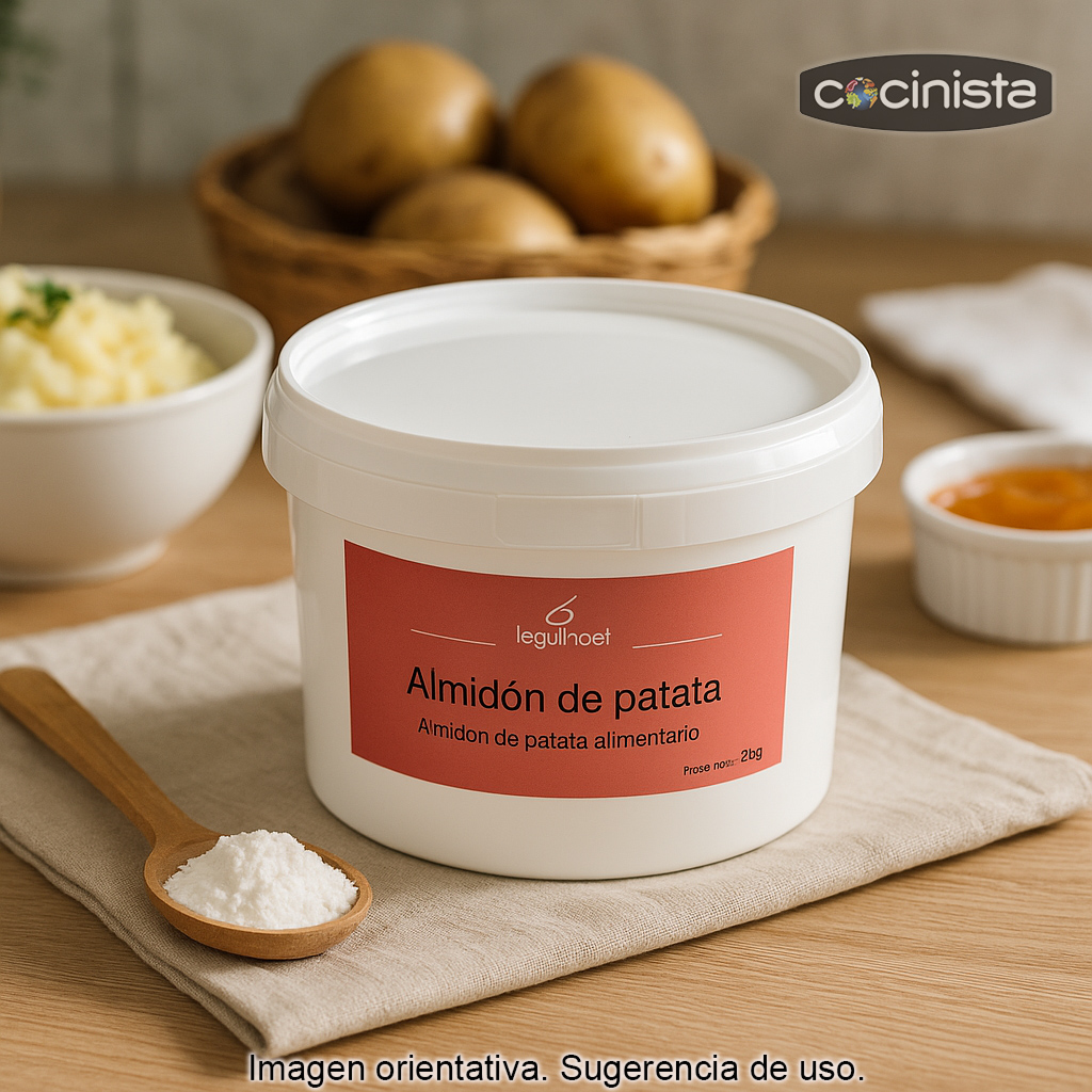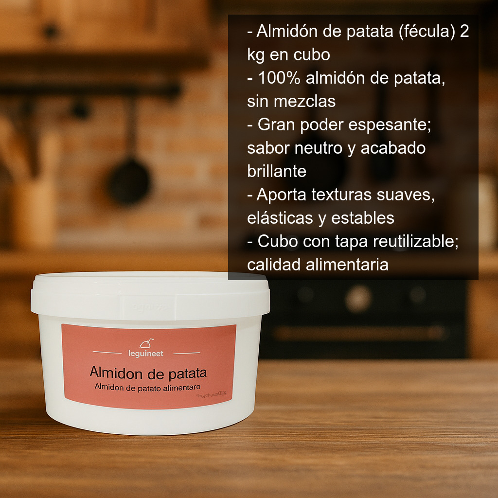 Este producto es puro almidón de patata de calidad alimentaria, sin mezclas, pensado para un uso frecuente en casa o en cocina profesional. Se presenta en cubo con tapa reutilizable con 2 kg de producto, cómodo para almacenar y mantener el contenido protegido.