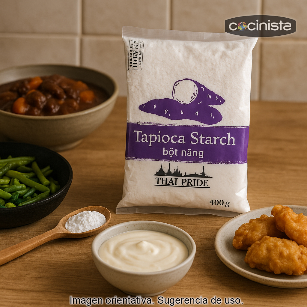 Almidón de tapioca en polvo extrafino (también conocido como tapioca starch o harina de tapioca). Es un ingrediente muy versátil en cocina, apreciado por su gran poder espesante, su sabor neutro y por aportar una textura brillante y sedosa a salsas, cremas y rellenos. Ideal para tener siempre en la despensa si buscas un espesante rápido y eficaz.