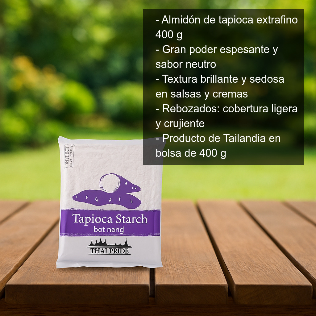 Este almidón de tapioca se sirve en bolsa de 400 g. Producto de Tailandia.