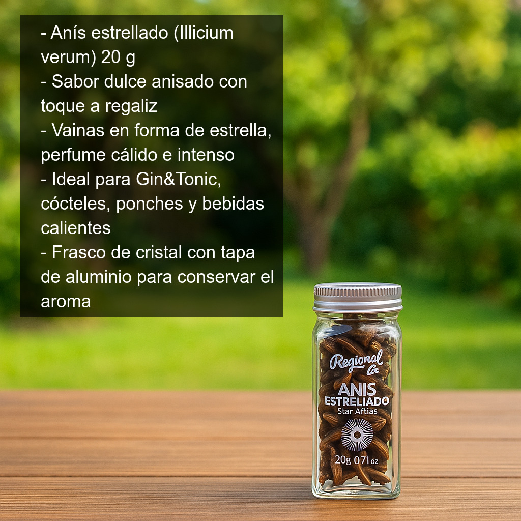 En coctelería, el anís estrellado es un clásico para aromatizar Gin&Tonic: aporta un olor suave y dulzón con un marcado aroma anisado que combina especialmente bien con ginebras cítricas o especiadas. También es excelente para dar un toque distintivo a cócteles, ponches y bebidas calientes.