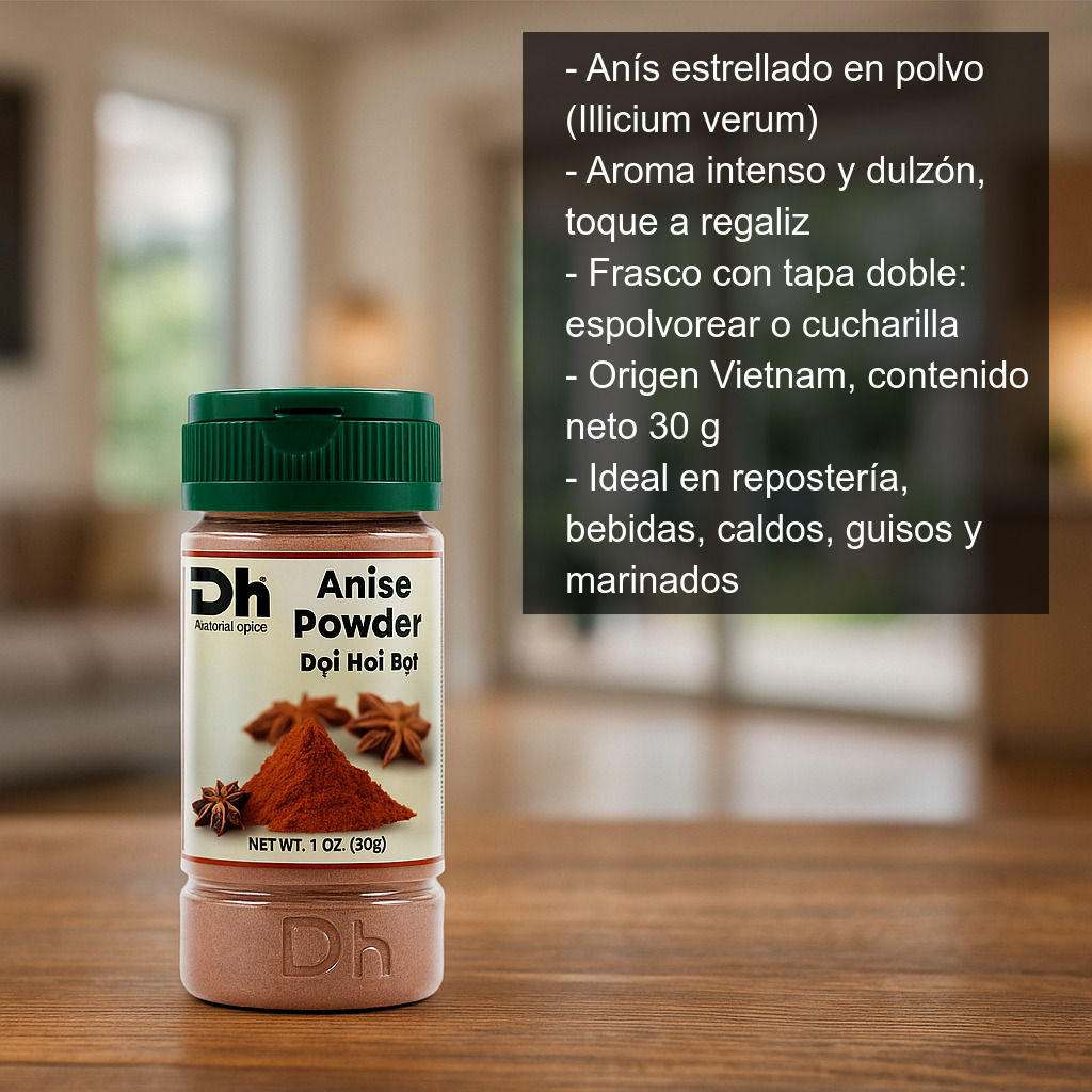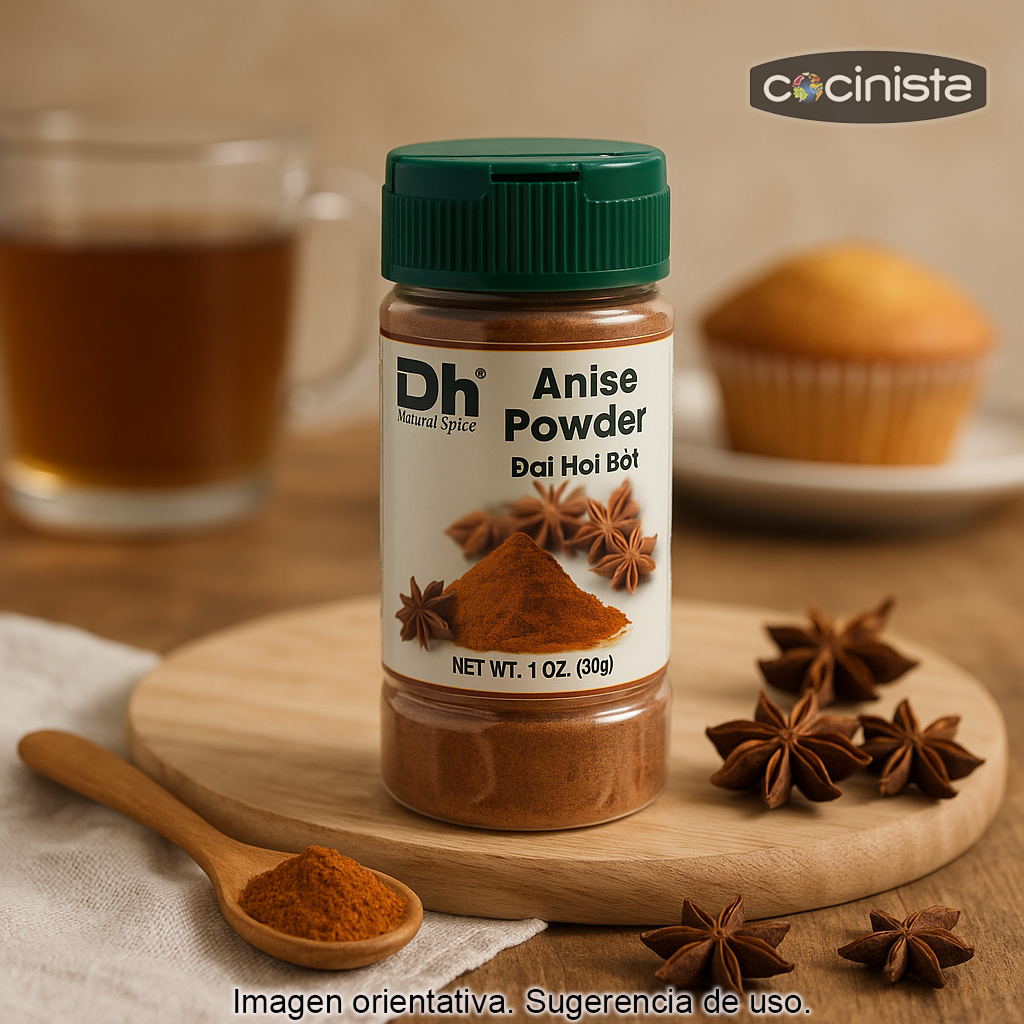 Anís estrellado en polvo (Illicium verum) de aroma intenso y dulzón, ideal para dar un toque especiado y ligeramente regaliz a tus recetas. Este anís estrellado molido se presenta en un práctico frasco con tapa doble: una parte para espolvorear directamente y otra apertura más amplia para extraer la especia con una cucharilla, facilitando un uso limpio y preciso en cocina.