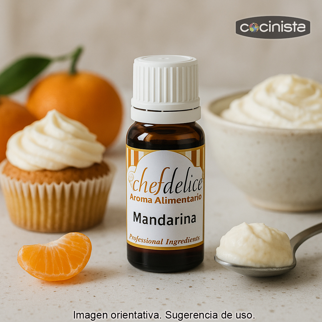 El aroma alimentario de mandarina (10 ml) es un aromatizante superconcentrado pensado para aportar un sabor cítrico, fresco y natural a tus recetas de repostería y heladería con una dosificación muy precisa. Es ideal para quienes buscan un sabor a mandarina intenso sin añadir azúcar ni modificar la textura de la preparación.