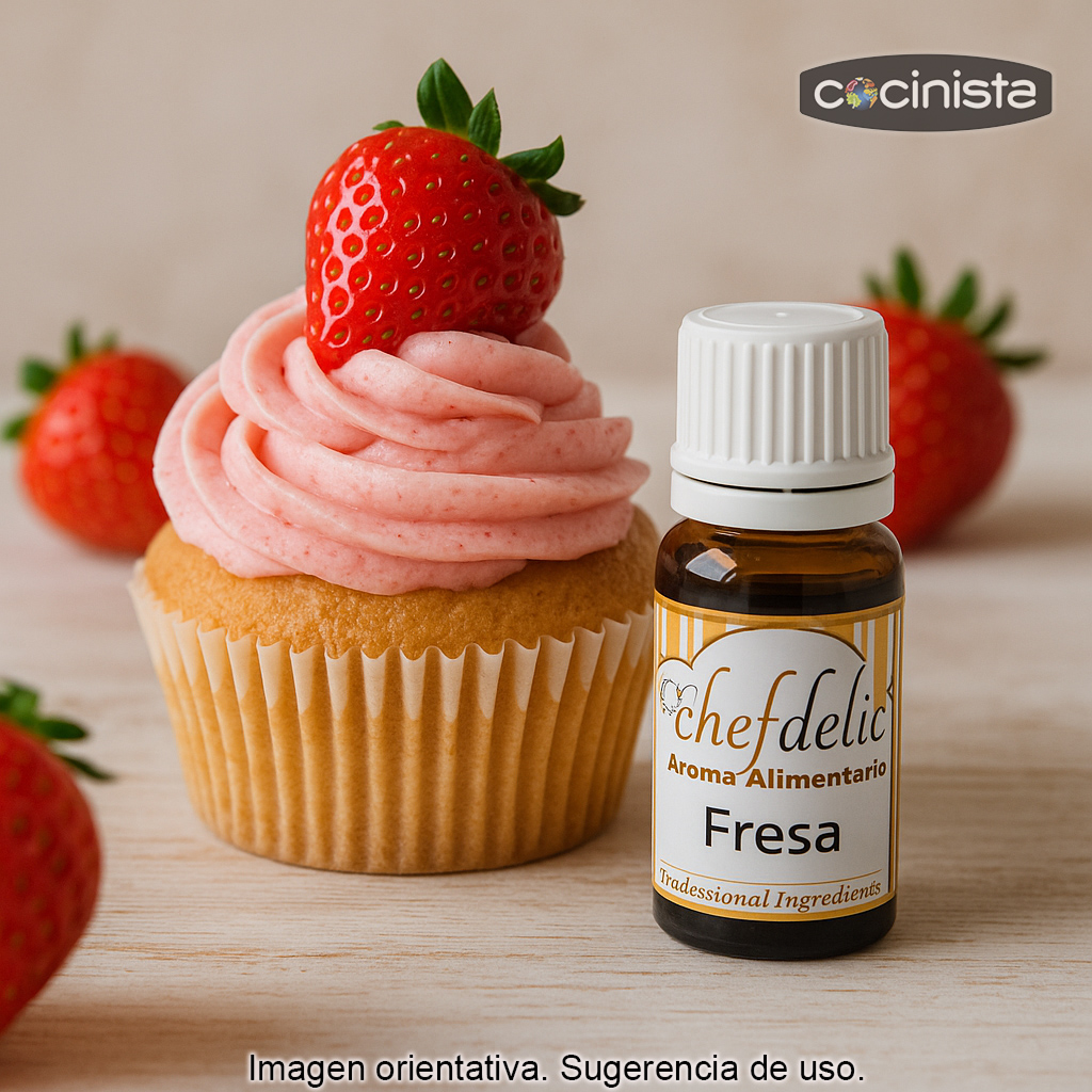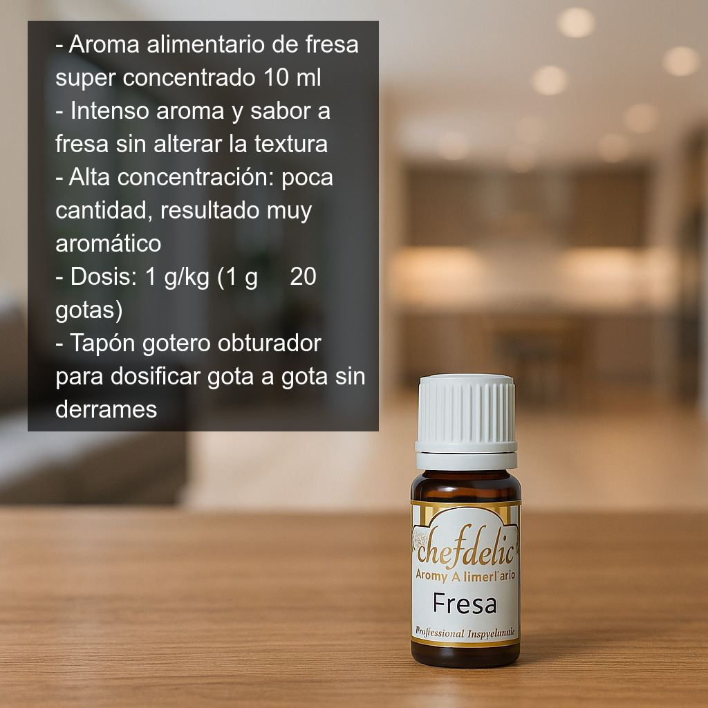 El aroma alimentario de fresa super concentrado (10 ml) es ideal para aportar un intenso aroma y sabor a fresa a tus elaboraciones de repostería y pastelería sin alterar la textura de la masa. Gracias a su alta concentración, con una pequeña cantidad conseguirás un resultado muy aromático, perfecto tanto para recetas caseras como para uso profesional.