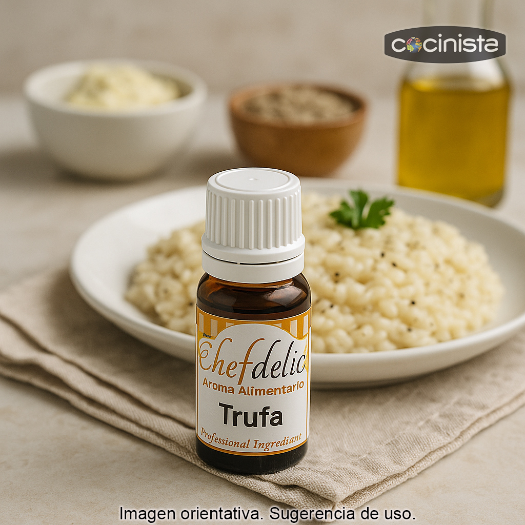 Este aroma de trufa está pensado para quienes buscan un resultado profesional con una pequeña cantidad de producto, realzando el carácter de platos como risottos, pastas, salsas, cremas, patés, rellenos, mantequillas aromatizadas o incluso elaboraciones innovadoras como aceites aromatizados y emulsiones.