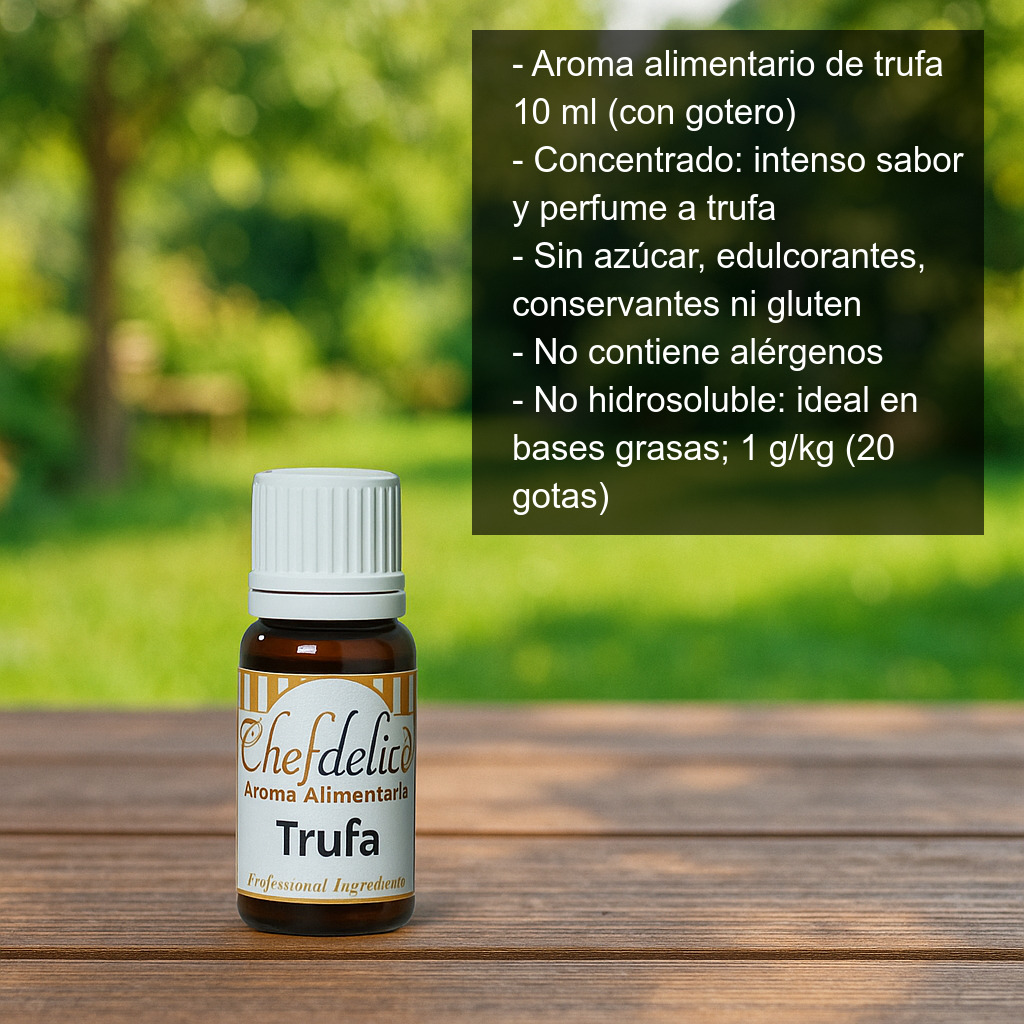 El aroma alimentario de trufa (10 ml) es un concentrado aromático ideal para aportar un intenso sabor y perfume a trufa a tus elaboraciones, con una dosificación precisa gracias a su tapón con gotero. Perfecto para dar un toque gourmet a recetas tanto saladas como creativas en cocina y repostería.