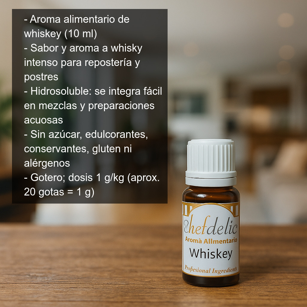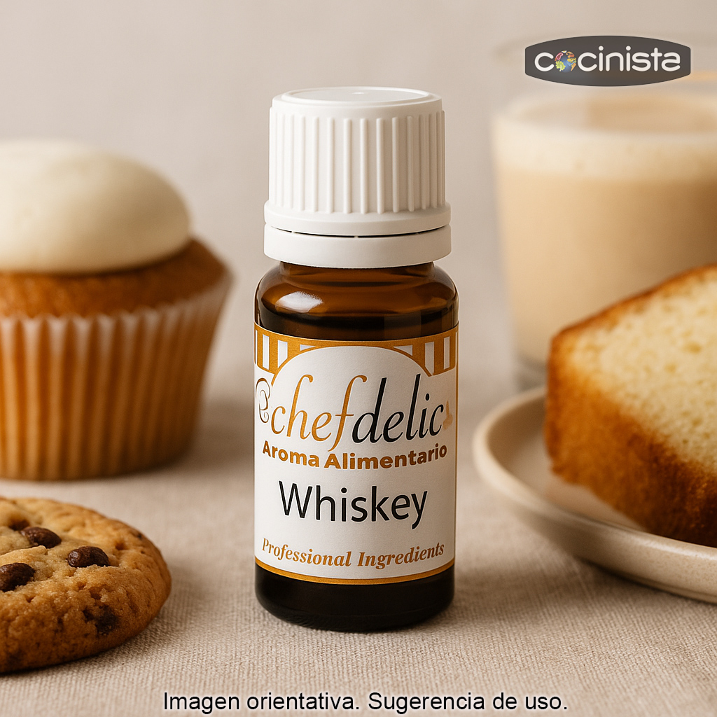 Con este aroma de whiskey para repostería podrás conseguir un perfil aromático característico sin complicaciones, manteniendo el control exacto de la intensidad gracias a su práctico gotero.