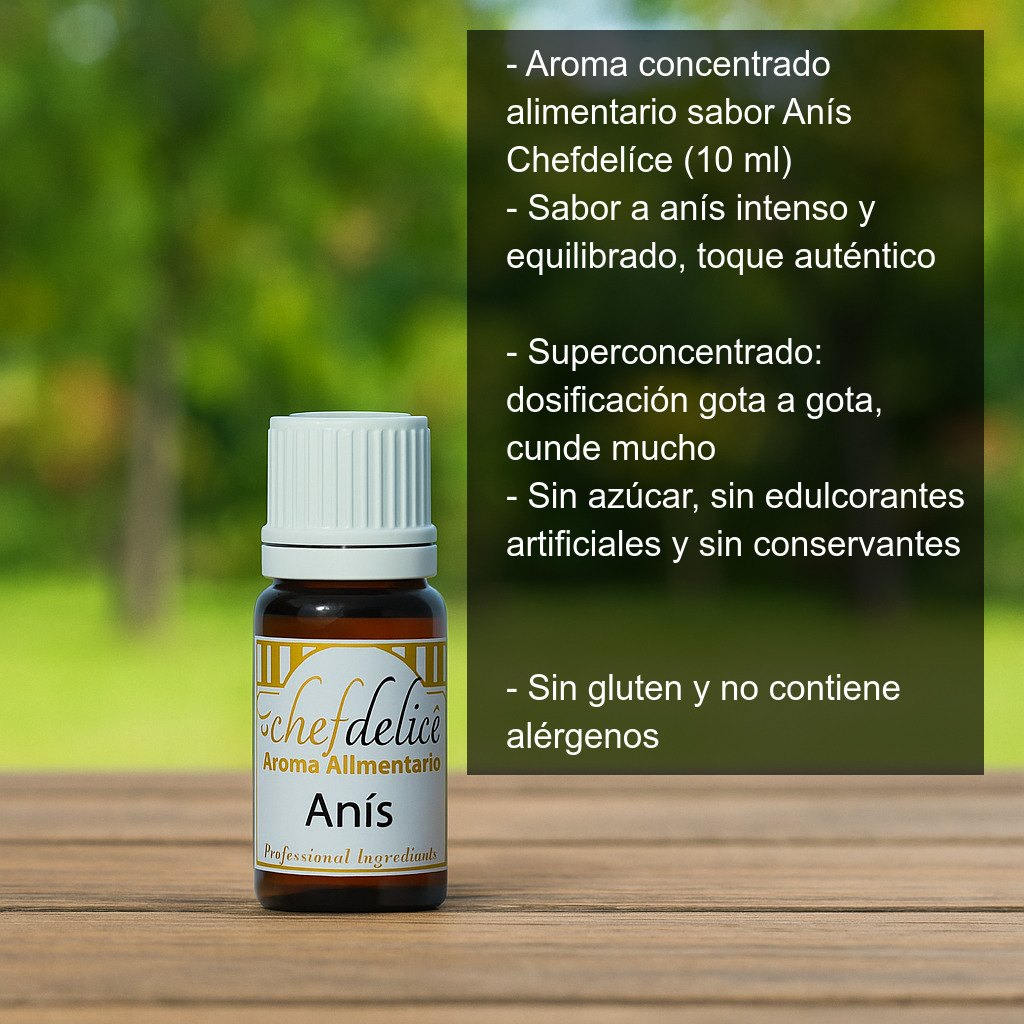 Aroma concentrado alimentario sabor Anís (10 ml) para dar un toque intenso y auténtico a tus elaboraciones de repostería y postres. Este aroma superconcentrado es ideal para aromatizar con precisión bizcochos, magdalenas, cupcakes, galletas, fondant, frosting, cremas, batidos y helados, aportando un sabor “redondo” con muy poca cantidad.