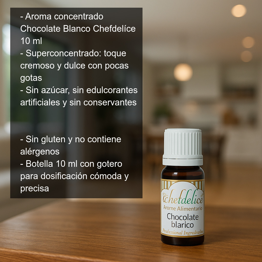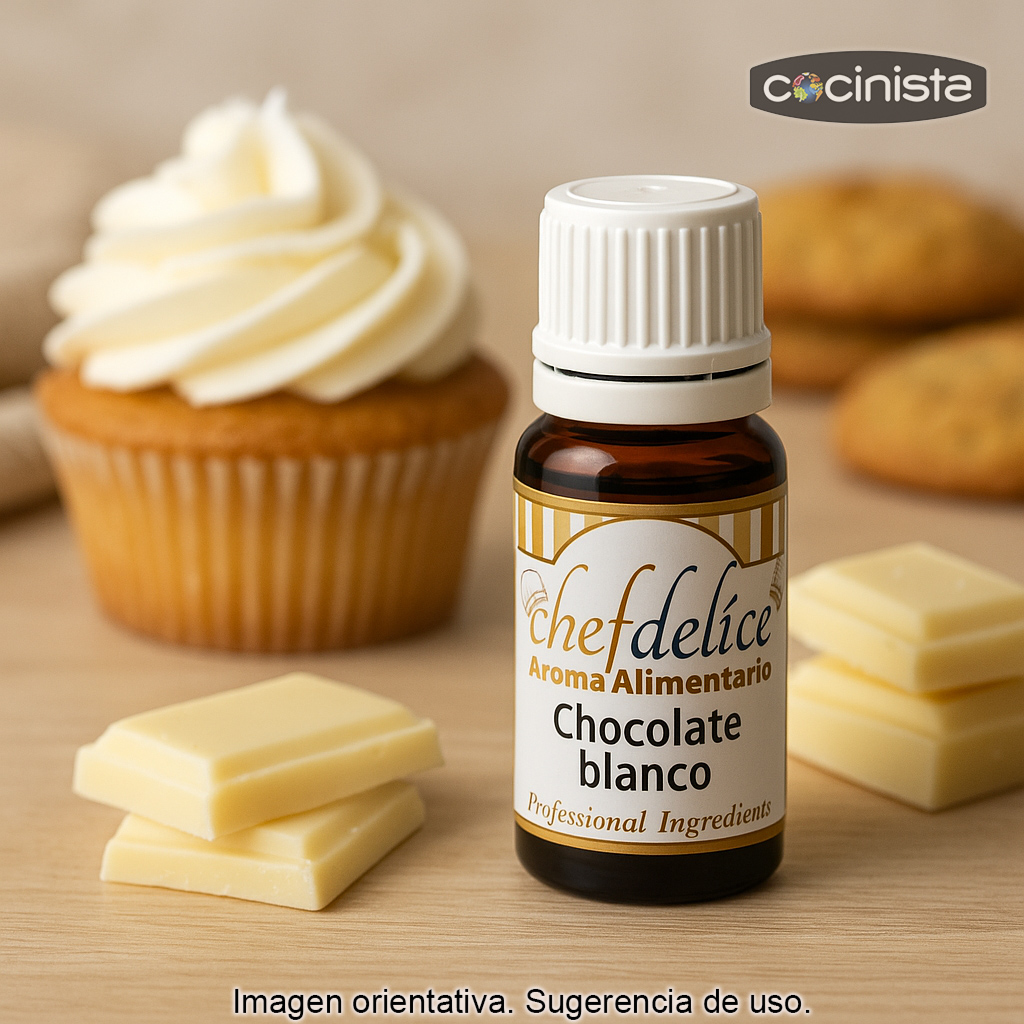 Aroma concentrado alimentario sabor Chocolate Blanco (10 ml). Aroma superconcentrado ideal para dar un toque cremoso, dulce y “redondo” a tus elaboraciones de repostería y heladería con muy poca cantidad. Perfecto para aromatizar bizcochos, magdalenas, cupcakes, galletas, fondant, frosting, cremas, batidos y helados.