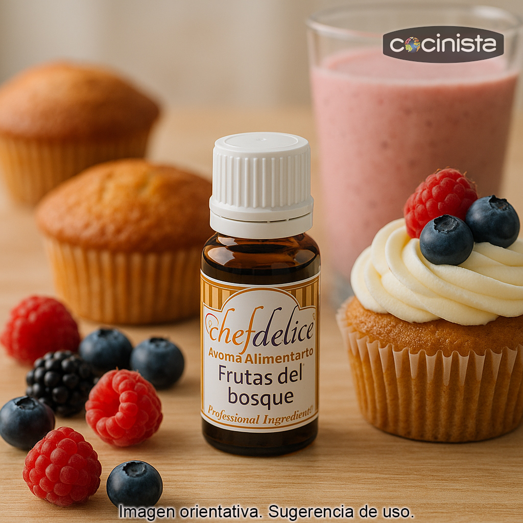 Ideas de uso: aromatiza una crema de mantequilla para cupcakes, un glaseado para donuts, un ganache para rellenos, un helado casero o un batido de yogur con frutos rojos. También funciona muy bien en masas neutras (vainilla, nata o chocolate) para crear combinaciones tipo “chocolate y frutos del bosque”.
