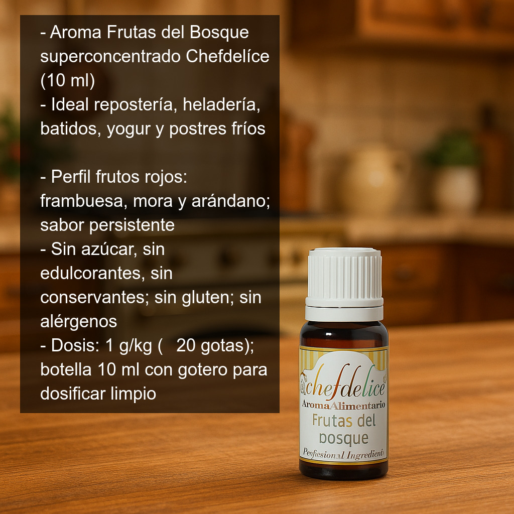 Su perfil recuerda a una mezcla de frutos rojos y del bosque (tipo frambuesa, mora y arándano), aportando un sabor “redondo” y persistente con muy poca cantidad. Es perfecto para recetas en las que buscas un sabor a frutas del bosque definido sin añadir azúcar ni modificar la textura de la masa o la crema.
