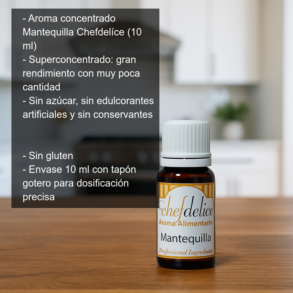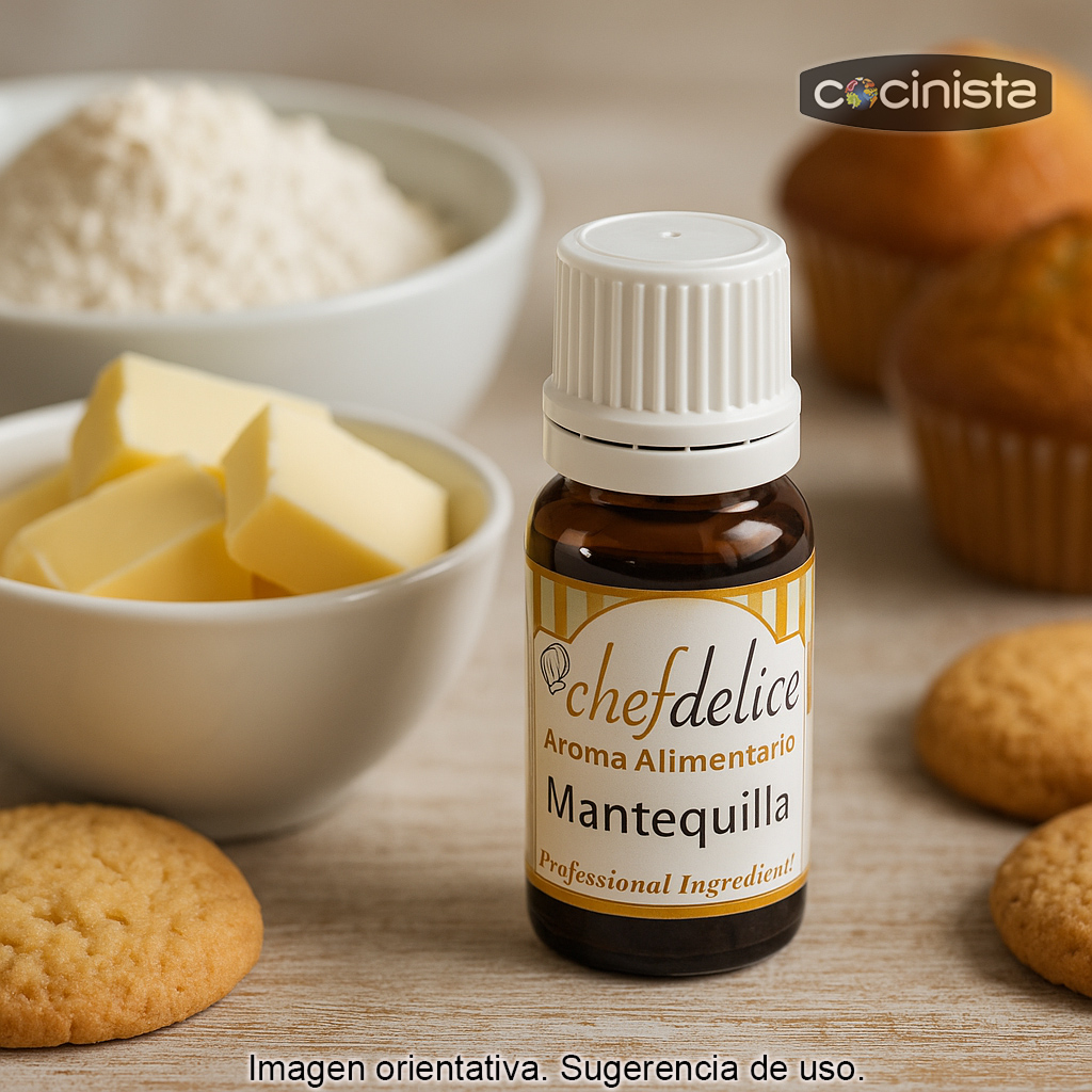 Aroma concentrado alimentario sabor Mantequilla (10 ml), perfecto para dar un toque auténtico y “redondo” a tus recetas de repostería y heladería con una cantidad mínima. Este aroma superconcentrado Chefdelíce está pensado para quienes buscan un sabor a mantequilla intenso y equilibrado sin necesidad de añadir mantequilla extra a la preparación.