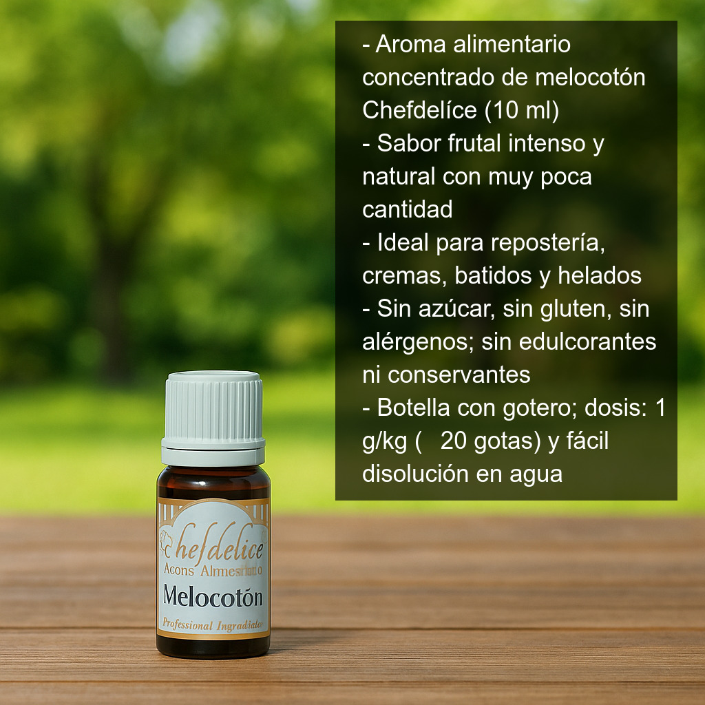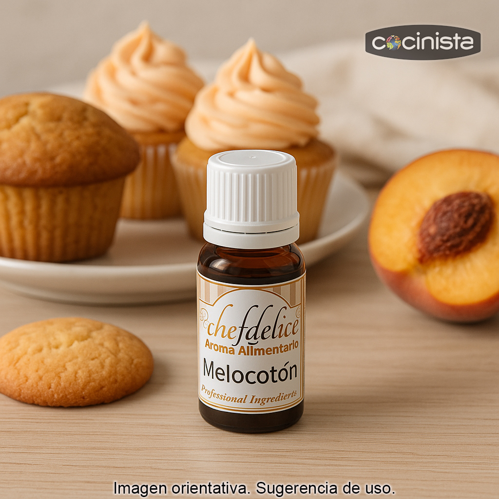Aroma alimentario concentrado de melocotón (10 ml) para dar un sabor frutal intenso y natural a tus elaboraciones. Este aroma superconcentrado es ideal para aromatizar bizcochos, magdalenas, cupcakes, galletas, así como fondant, frosting, cremas, batidos y helados. Con muy poca cantidad conseguirás un resultado “redondo”, perfecto tanto para repostería casera como para uso profesional.