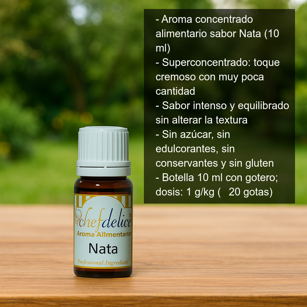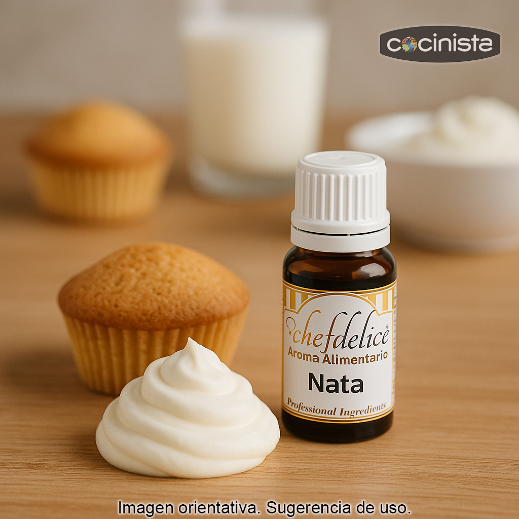 Aroma concentrado alimentario sabor Nata (10 ml). Aroma superconcentrado ideal para dar un toque cremoso y “redondo” a tus elaboraciones de repostería y heladería con muy poca cantidad. Perfecto para aromatizar bizcochos, magdalenas, cupcakes, fondant, frosting, galletas, batidos, helados, cremas, mousses y rellenos.