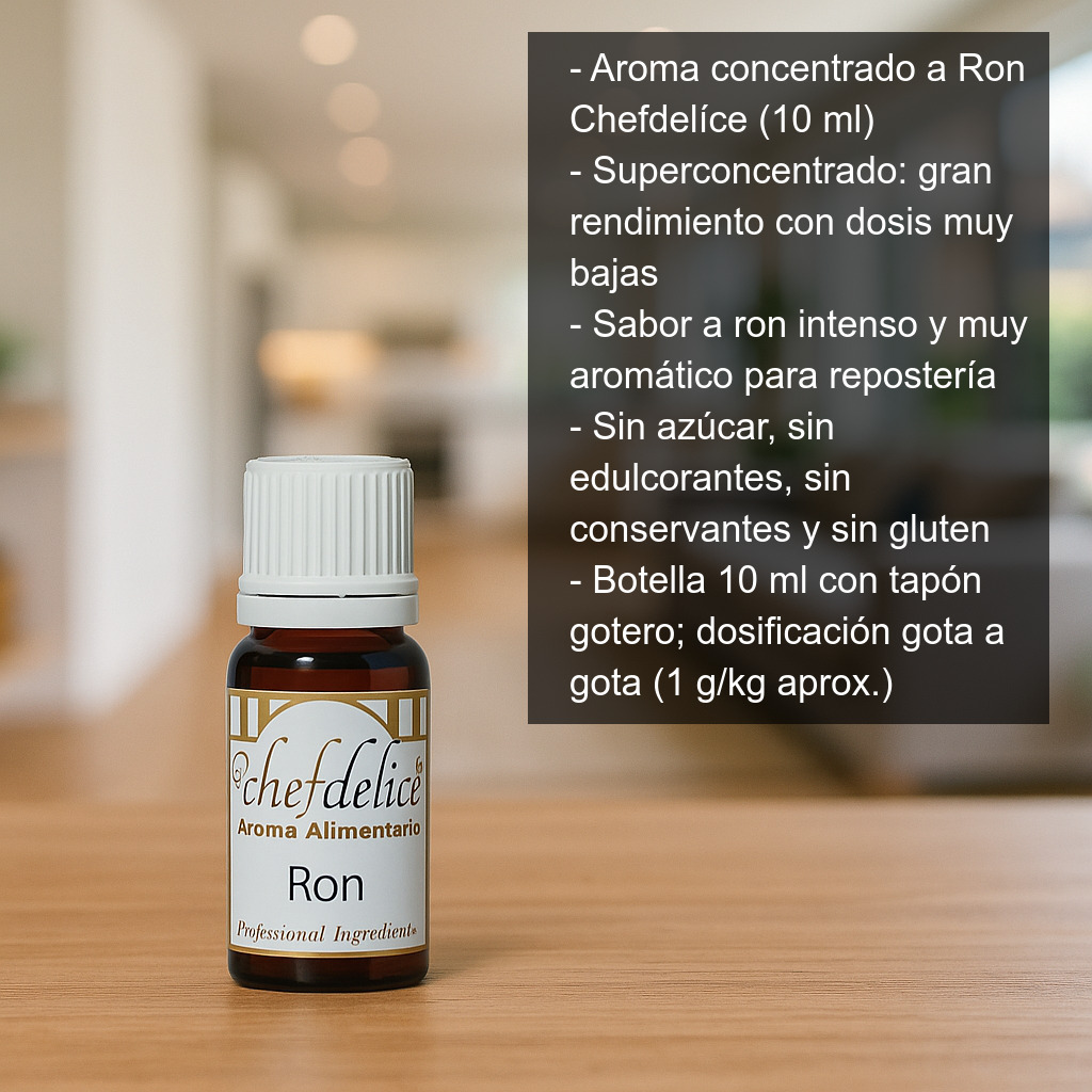 Aroma concentrado a Ron (10 ml) para uso alimentario. Un aroma superconcentrado ideal para dar un toque auténtico y “redondo” a tus elaboraciones de repostería y postres, con muy poca cantidad. Perfecto para aromatizar bizcochos, magdalenas, cupcakes, galletas, frosting, cremas, fondant, batidos y helados.